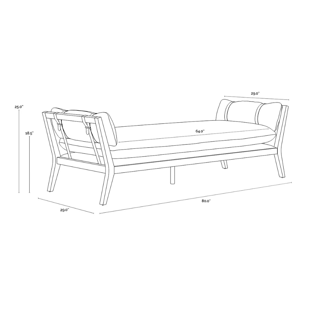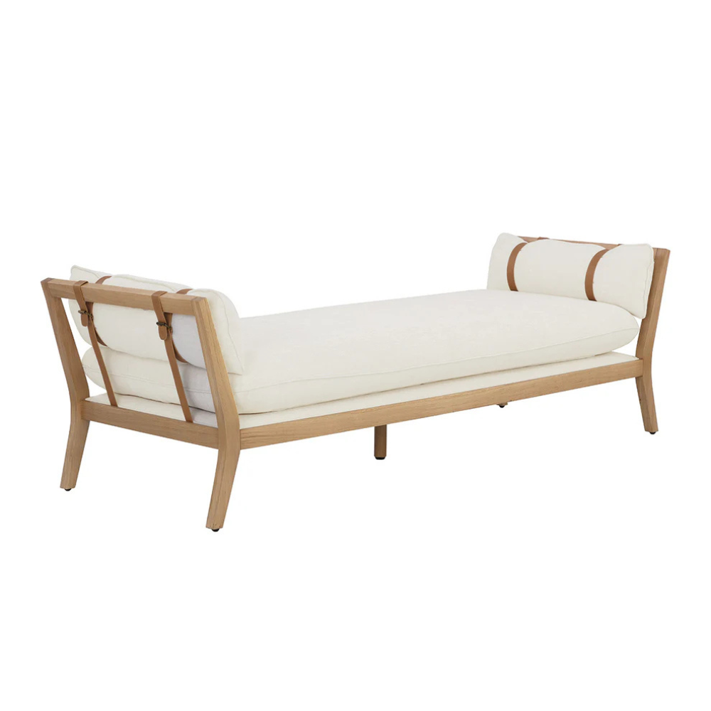 Bring space-saving comfort to any living space with the chic Adelina Daybed. Features a slim frame with curved legs built from solid wood. Expansive seating is upholstered in heather ivory tweed fabric with leather strap detailing on either side. As wood is an organic, porous material, these pieces will contain natural variation of texture and may also exhibit fine indentations and cracks. Wood pieces will also display a disparity of colour and grain, and visible knots and burls that add to the character of each piece. Handle with Care: This design has been crafted with 100% leather. Leather is a natural material; as such, colour variations, markings, wrinkles, grooves and light scratches are acceptable and appreciated characteristics. No two pieces are alike.