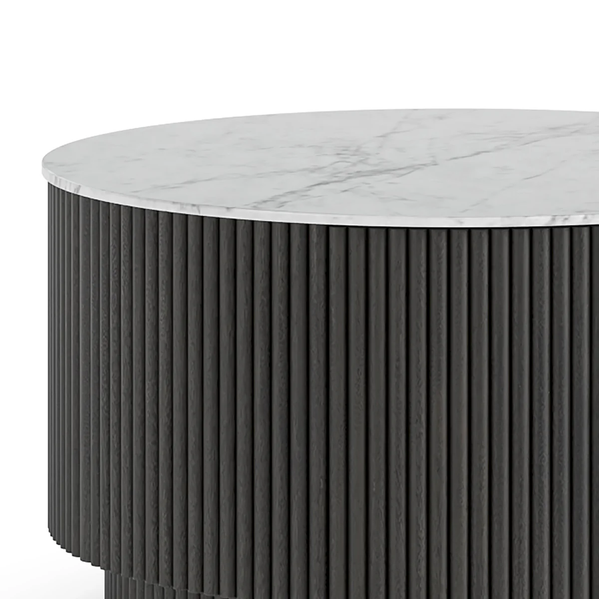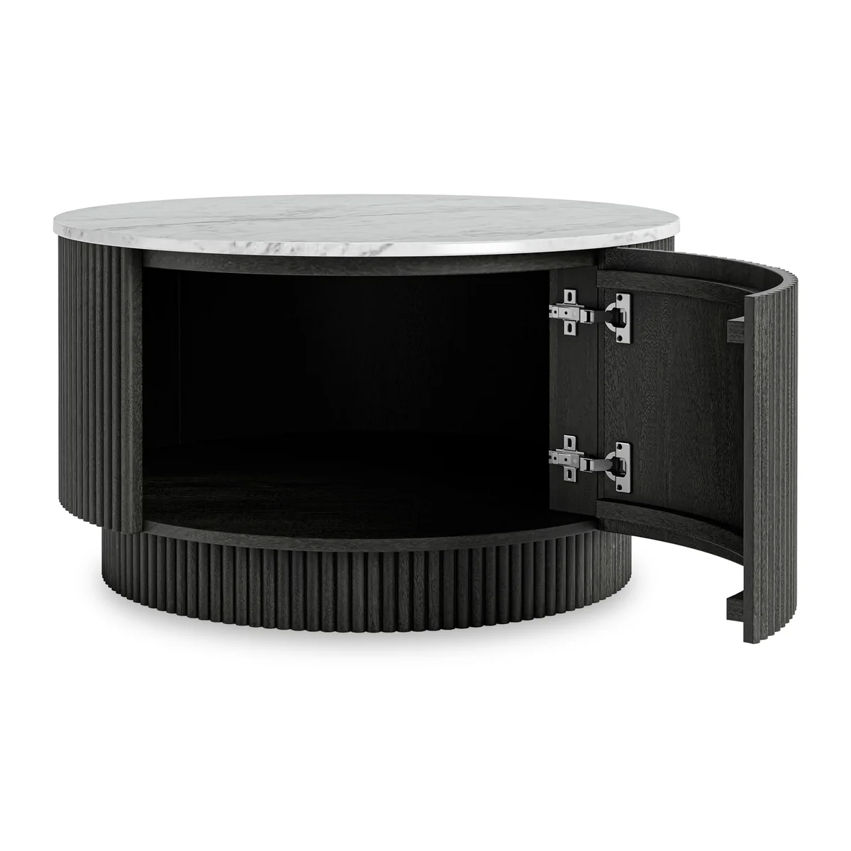We love the bold, clean, and modern look of the Round Amberhollow Coffee Table! The fluted detail on the sides of this table is crafted from quality solid wood and finished in a striking matt black or warm walnut stain.