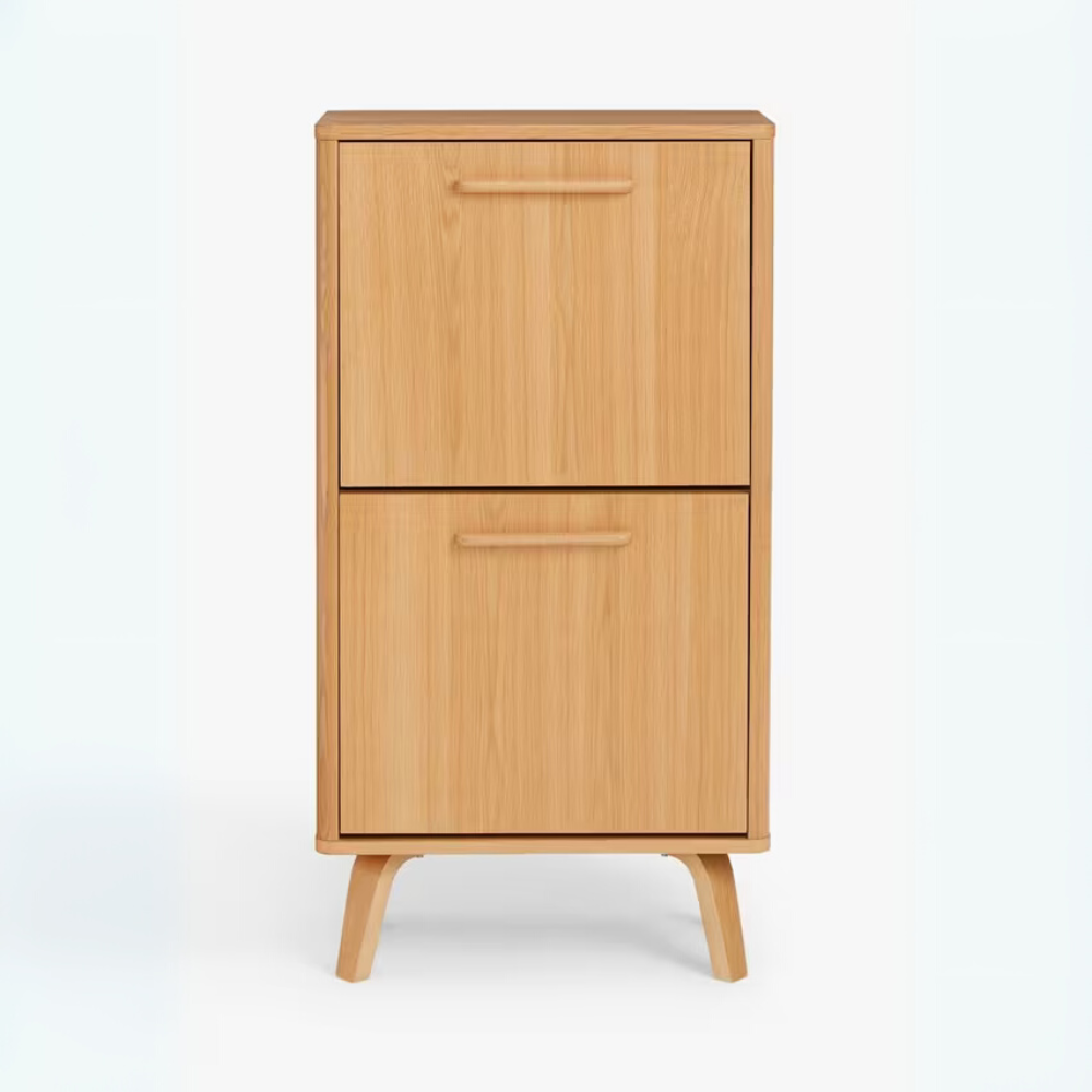 This Anton Tall Shoe Storage Cabinet offers relaxed mid-century styling, with classic splayed legs that are set under the base and linear handles that meet in the centre, sweeping a line across the front of the piece to give the simple profile an elegant focal point.