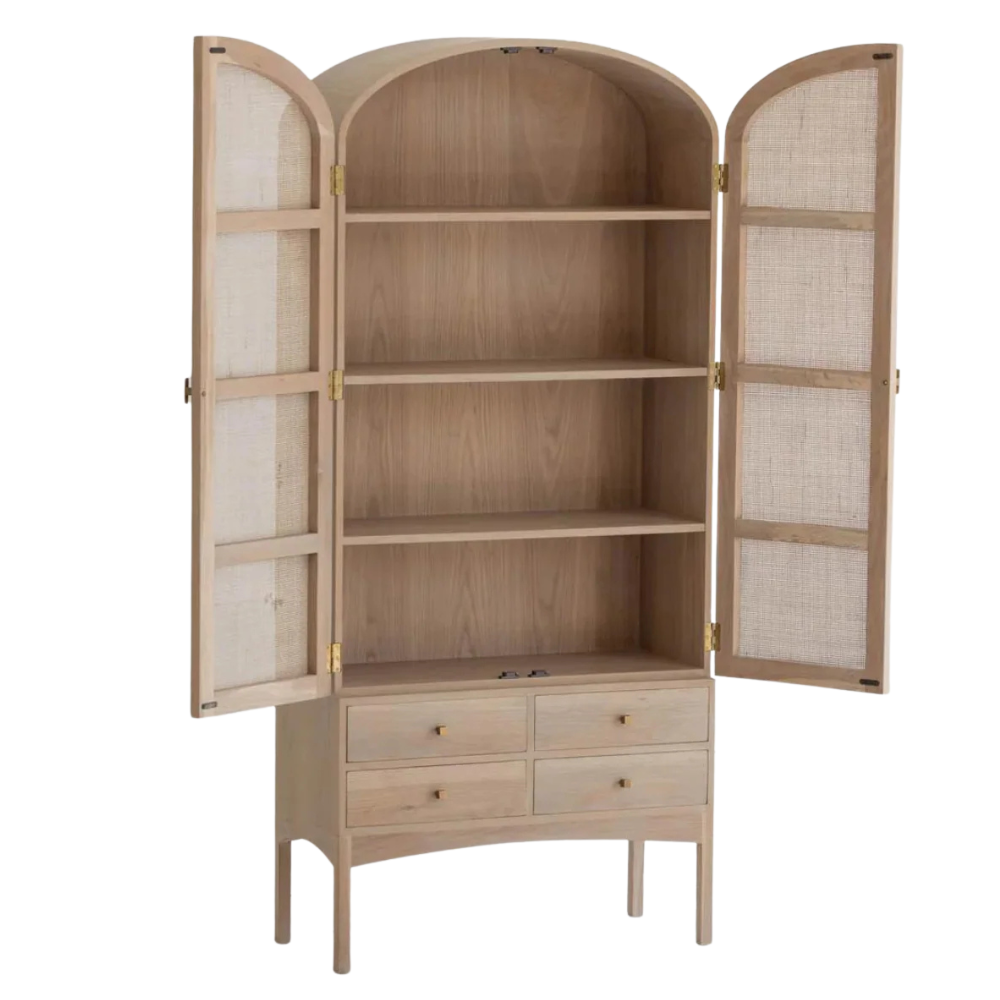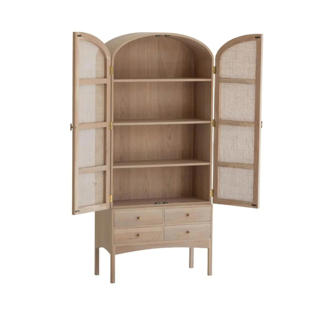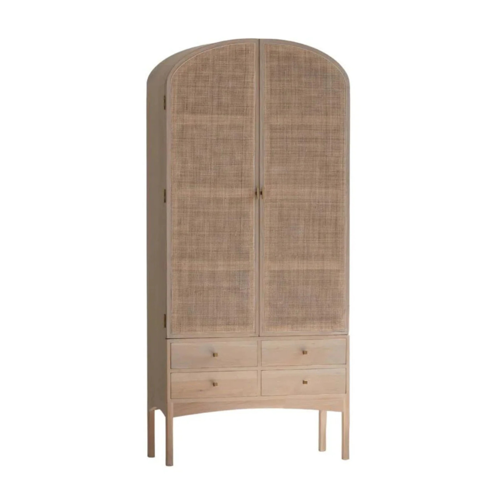 Arco Wardrobe with Natural Cane features a gradual transition from antique to modern, with a focus on form, curves, and pastel tones that evoke architectural shapes.