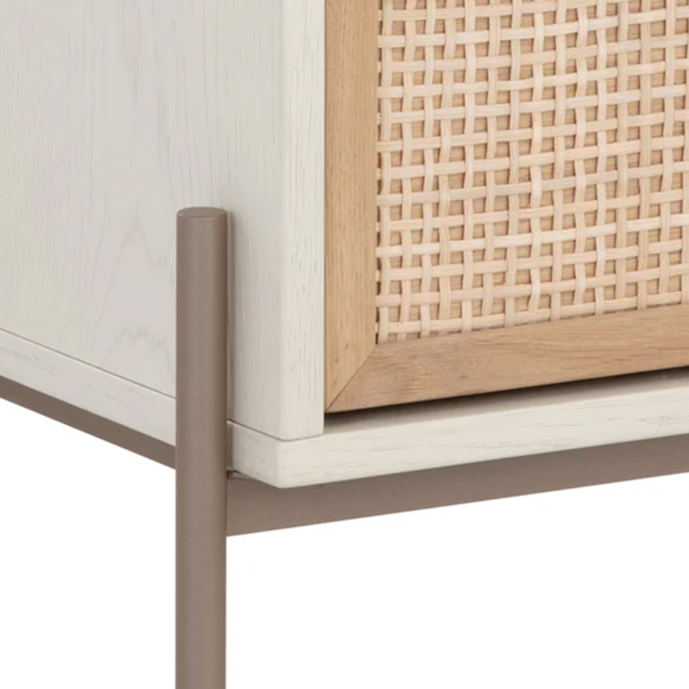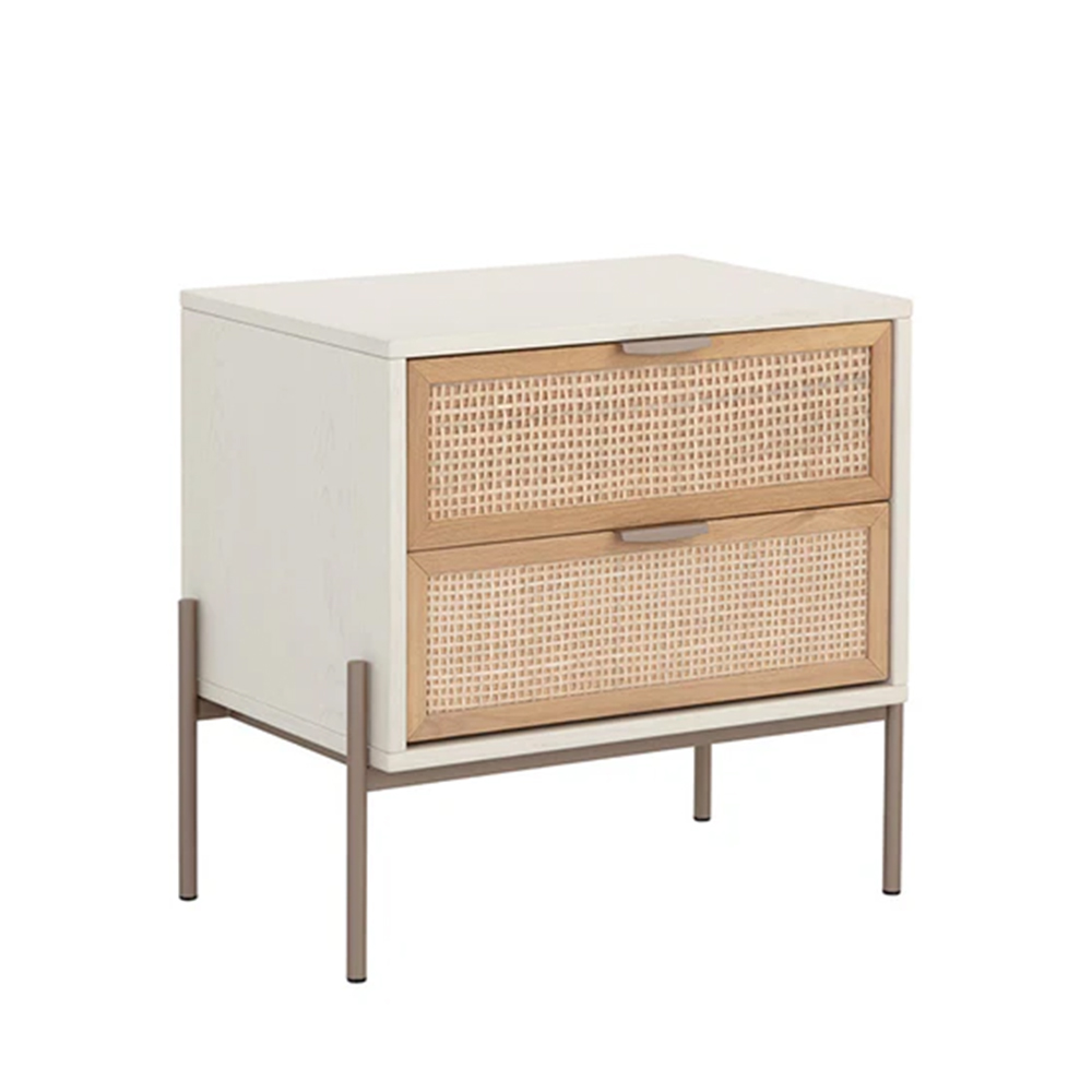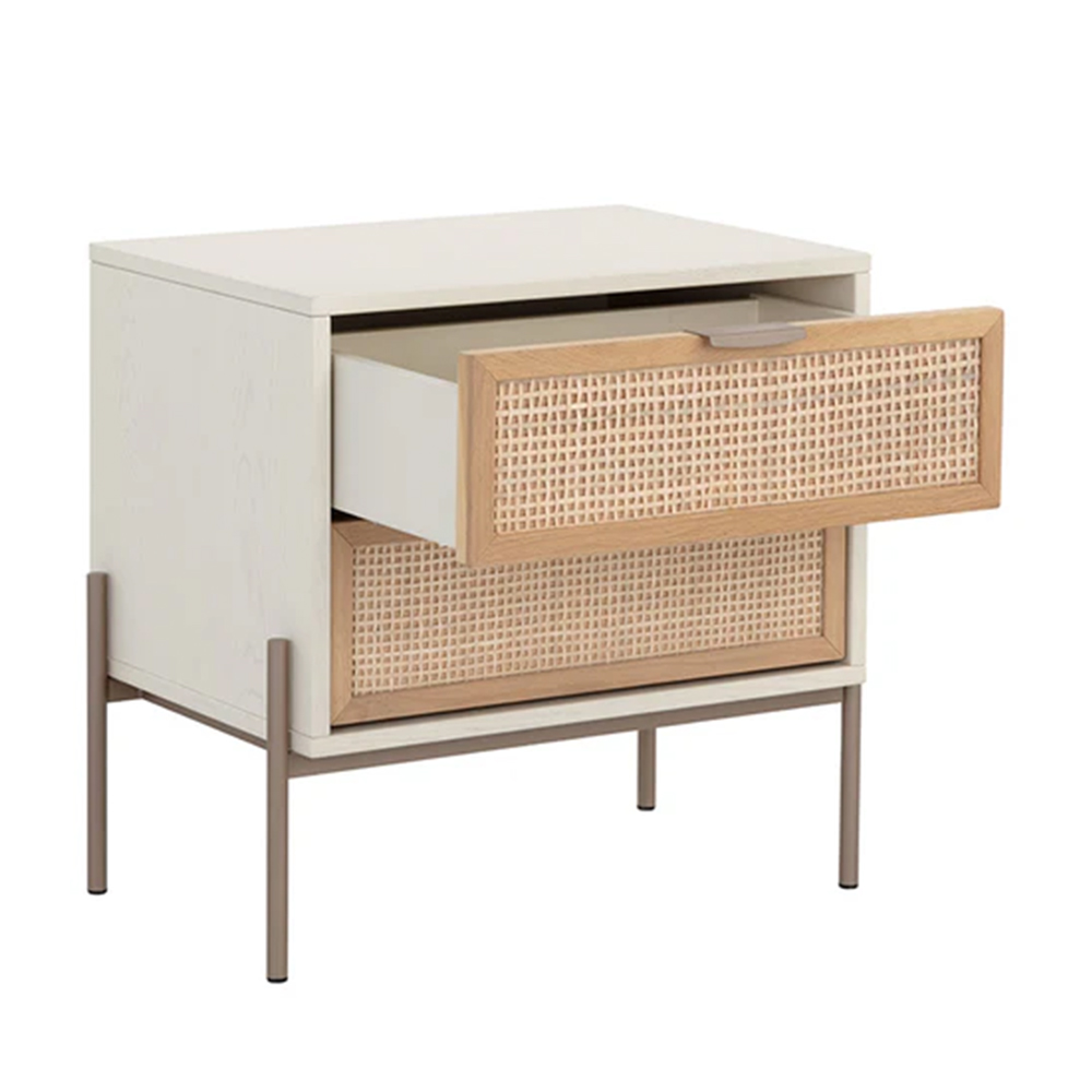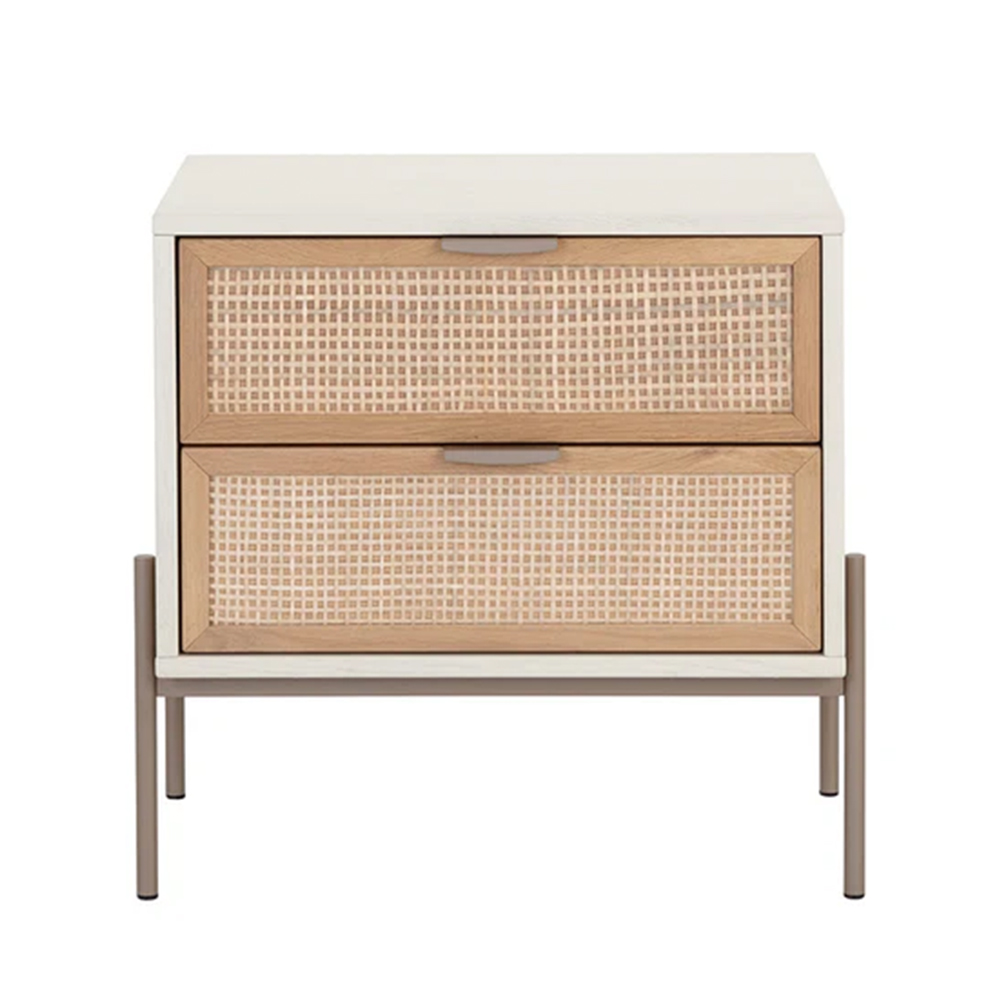 Create a bedroom influenced by global travels with this stylish Avida Nightstand crafted in India. Features two natural rattan drawers contrasted with a black oak wood frame. Gold iron feet and matte black steel handles complete the design.