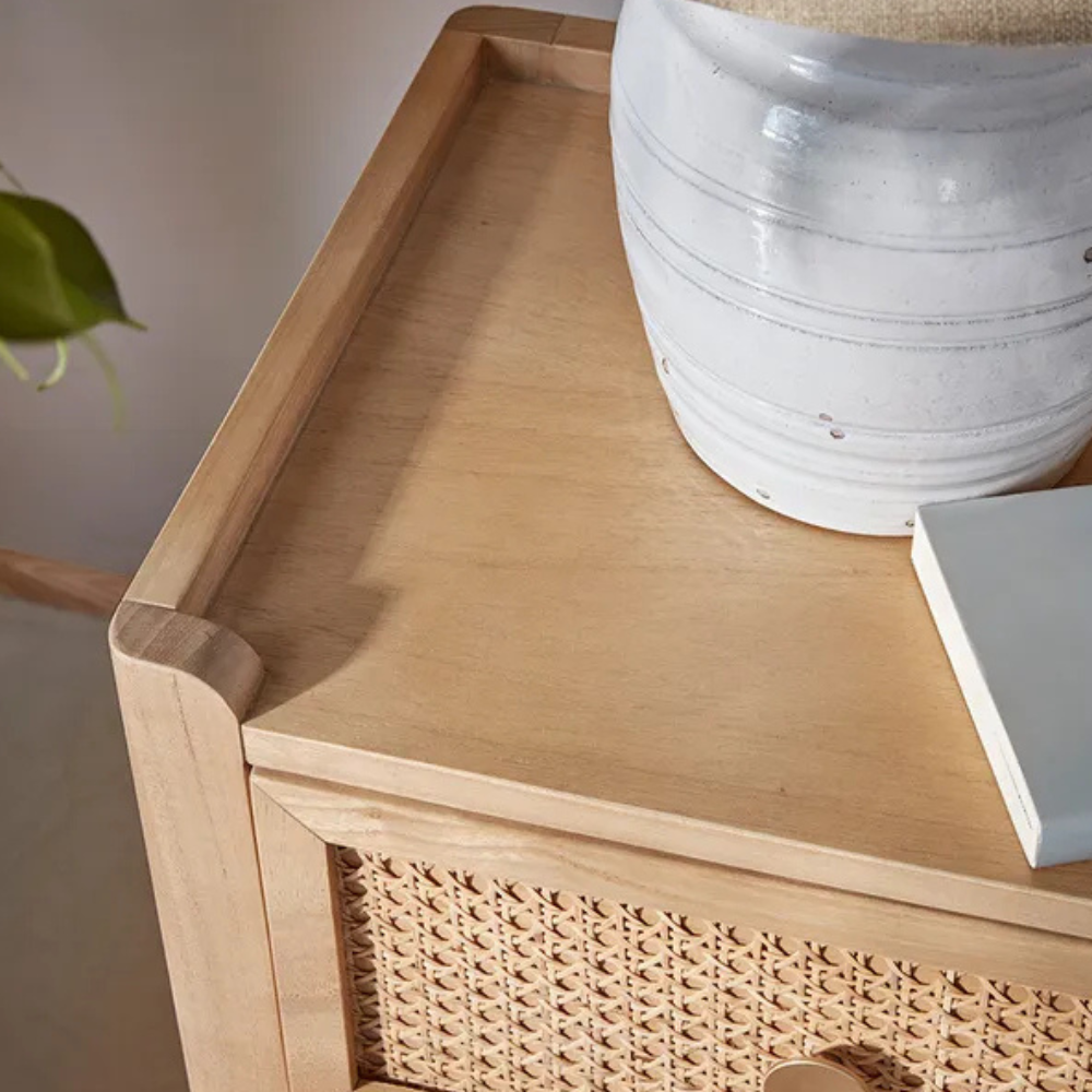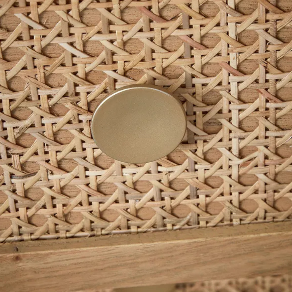 Another delightful piece of bedroom furniture from MOD Design. The range is in a light natural colour with a very retro rattan finish on all the door and drawer fronts, accented with very pretty brass-colored handles.