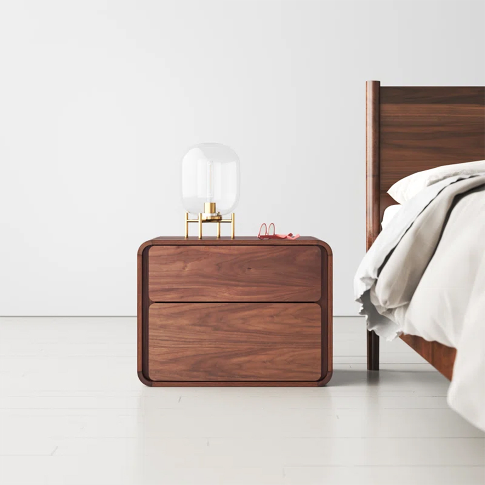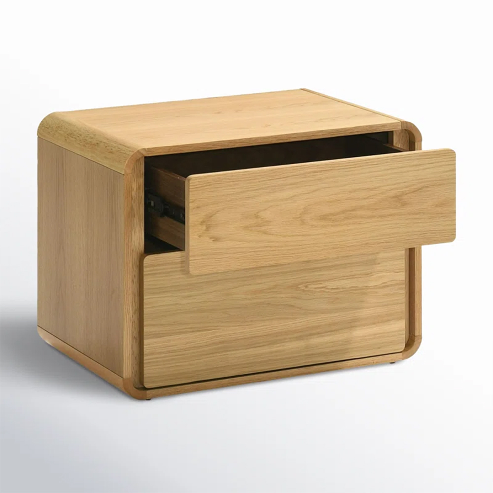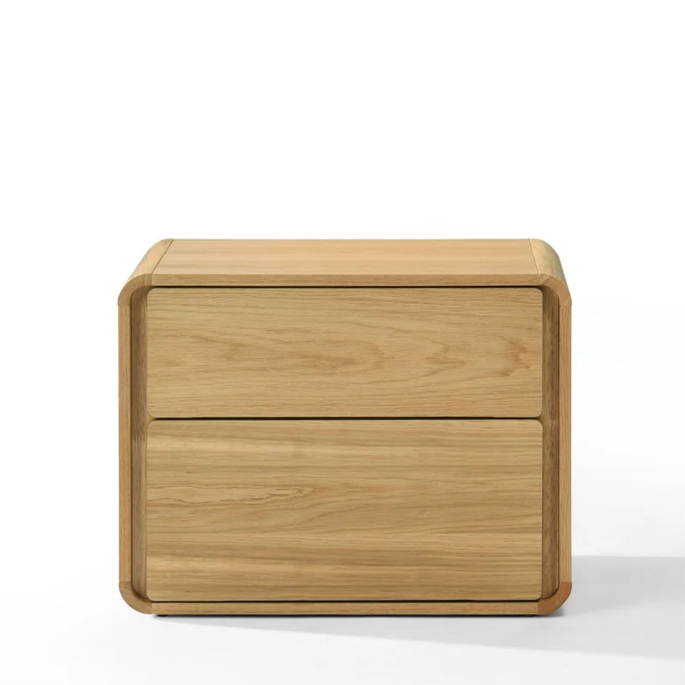 Bring streamlined storage to your Berkeley Two-Drawer Bedside Table. Crafted from solid wood, it showcases a smooth + subtle silhouette with lively natural graining. Two push-to-open drawers offer space for bedside essentials, keeping your phone, books, and reading glasses within easy reach.