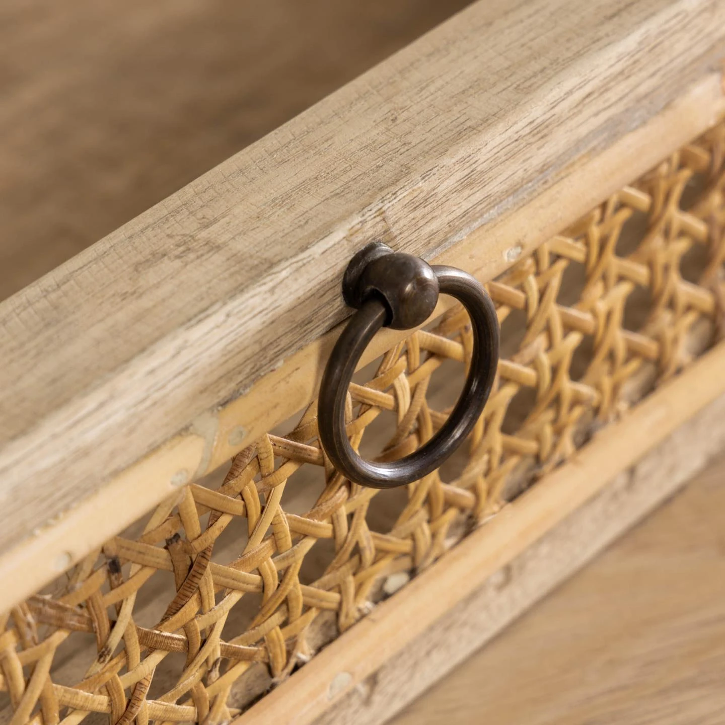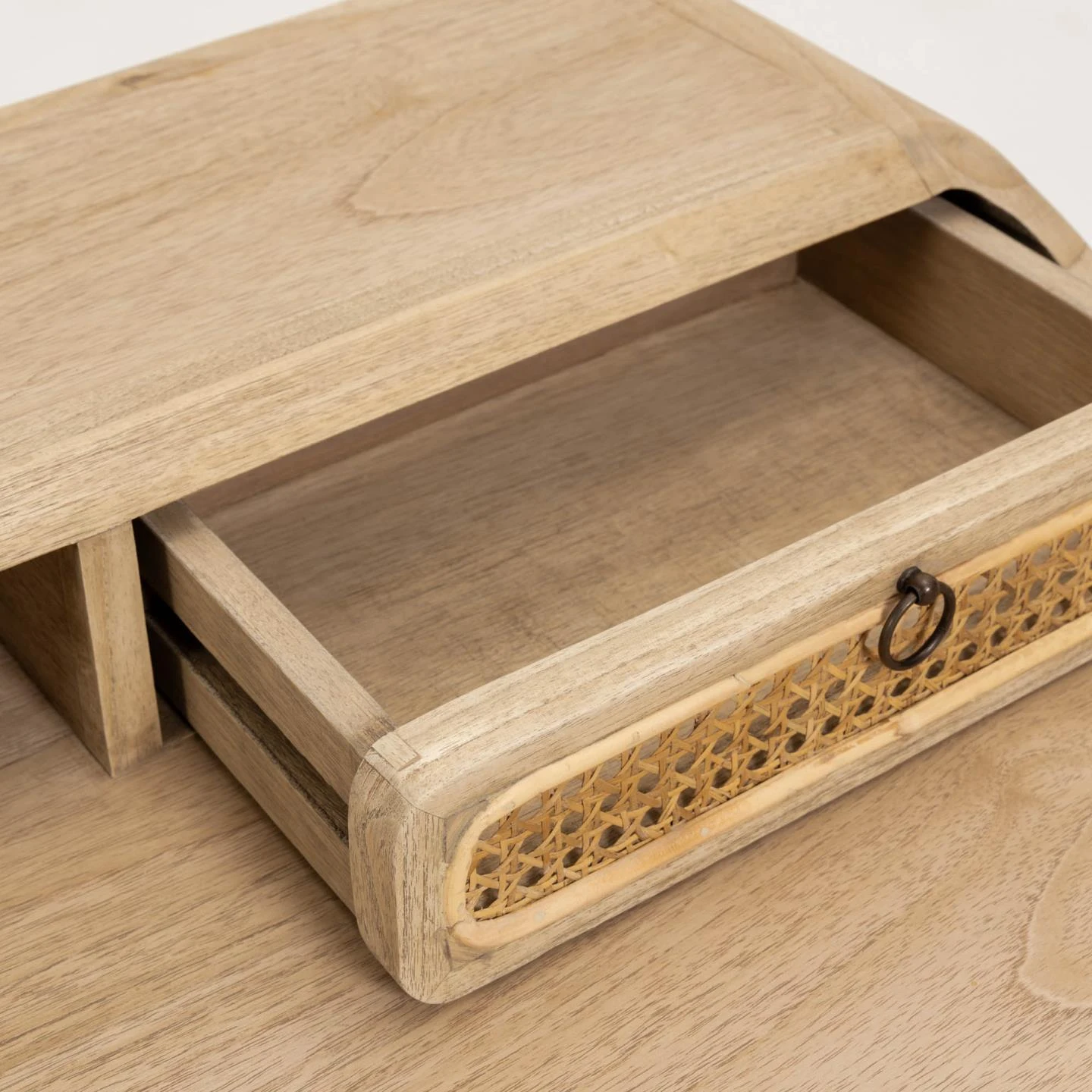 Denworth Study Table is made of solid wood with an aged effect. To make the points round, the wood is bent before the furniture is built. In addition, other parts are also curved to give the shape of the tabletop, just like the drawers to store your things. And to give it a trendy touch, the front is made of hand-woven rattan. It is an eco-friendly designer piece as the wood comes from sustainable forests where the trees are responsibly sourced.