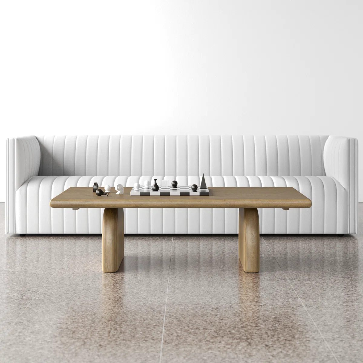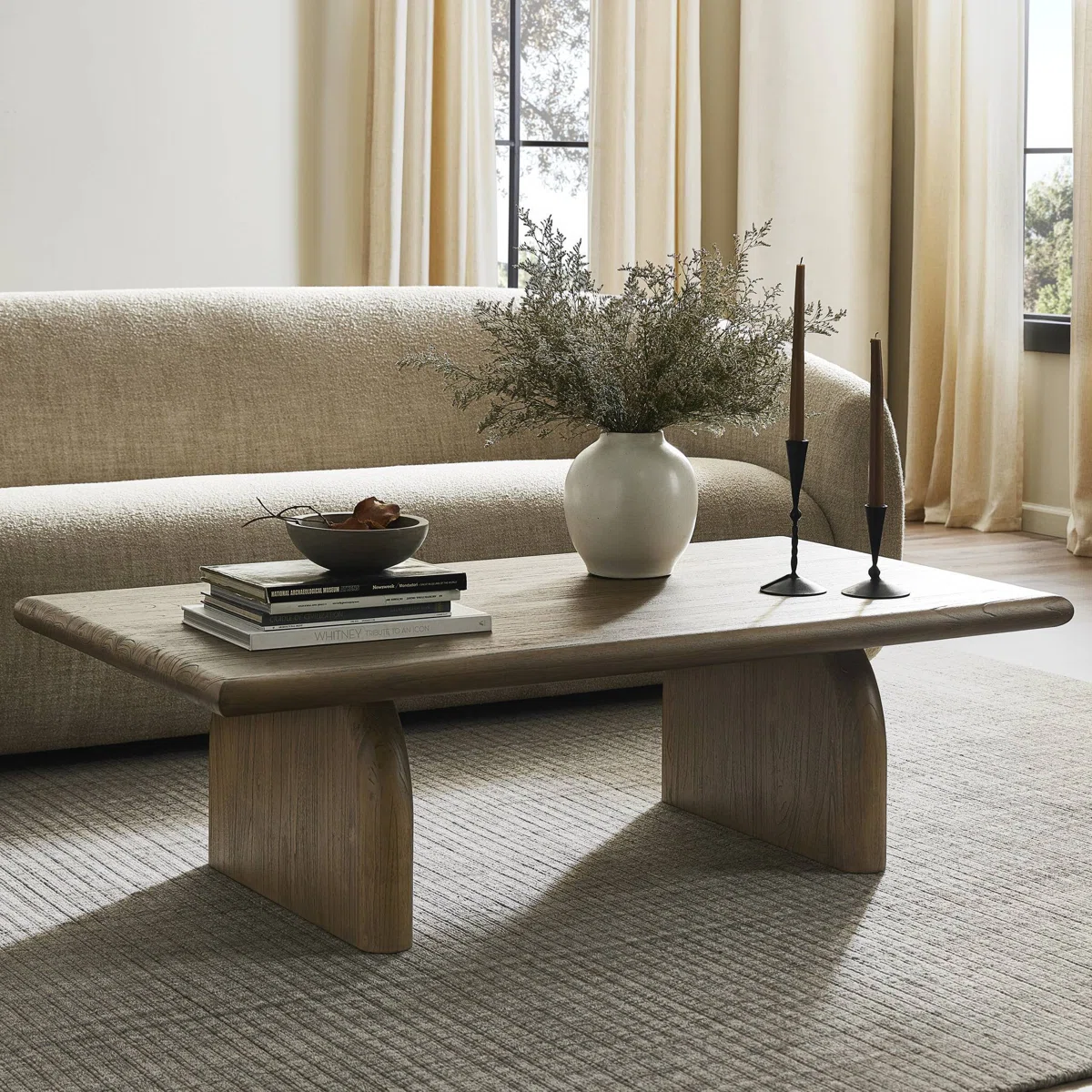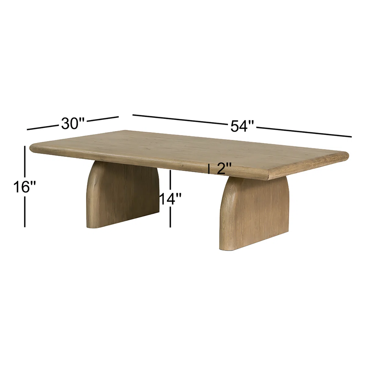 Minimalist-minded Fen Rectangular Coffee Table with large, exaggerated arches. Rectangular top with mitered detailing creates a spacious surface made with natural solid wood. This item is made for solid wood; finishes and colors can appear differently under natural, false, or fluorescent lighting.