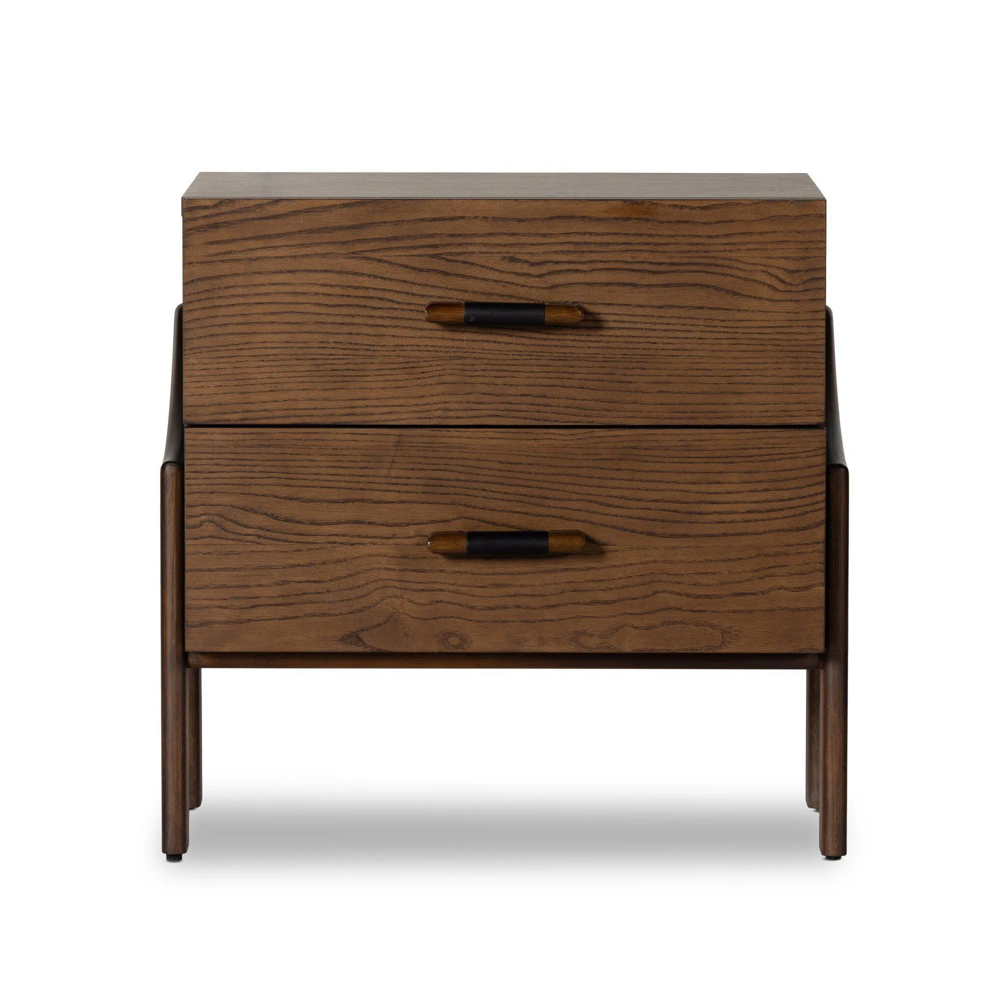 The Foxcroft Nightstand is made from solid wood with a brown finish and hardware. Wide-scale and sculptural details reflect the mid-century inspiration behind this dual-drawer nightstand.