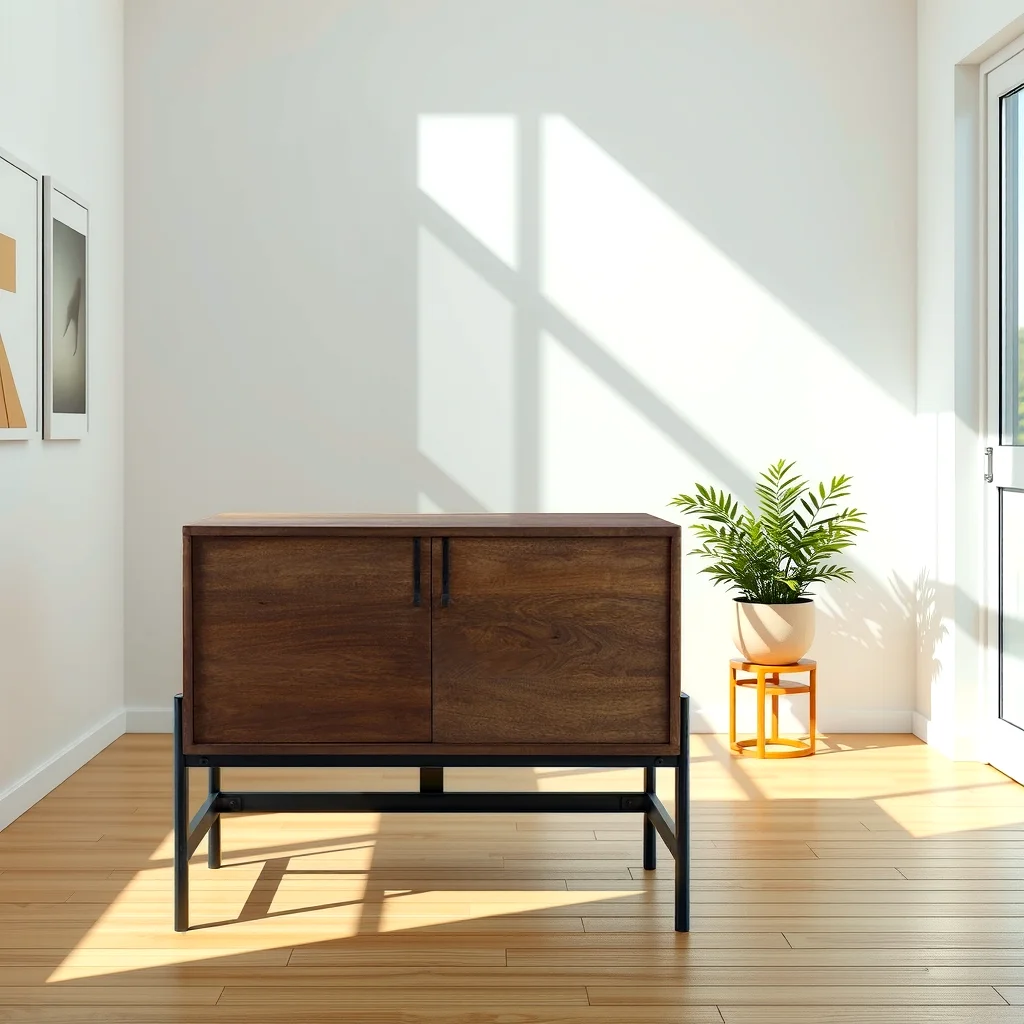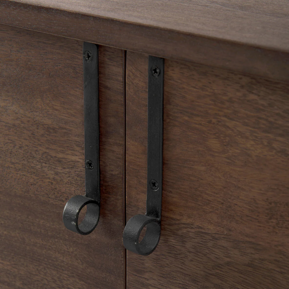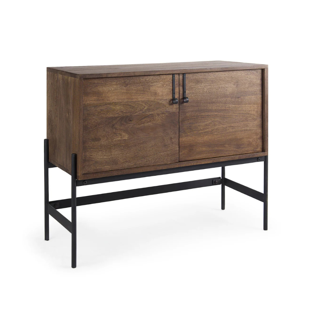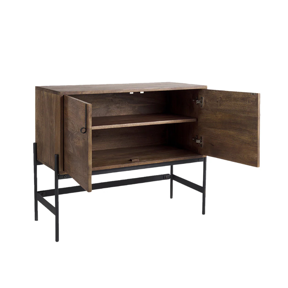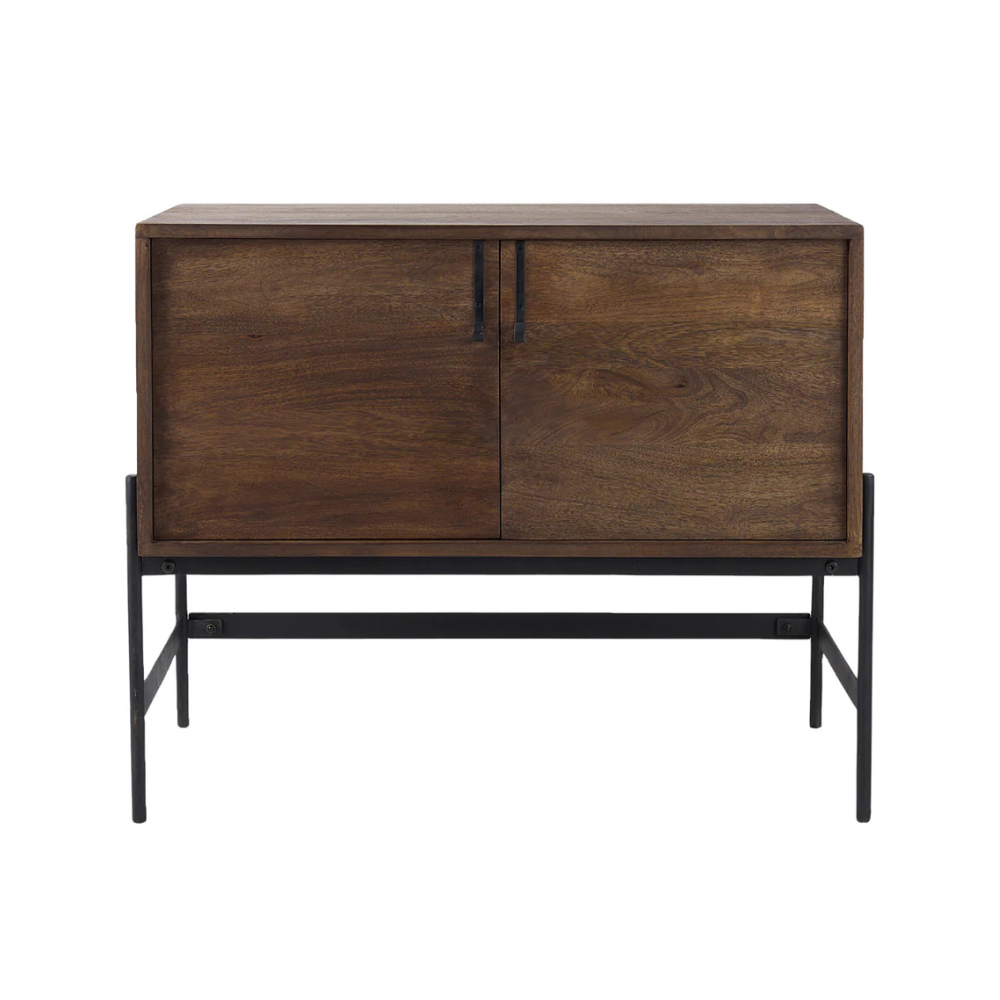 This modern accent Glenn Accent Cabinet features a solid wood body with two doors and two interior shelves that run along the length of the cabinet. The body is supported off the floor by a sturdy, iron frame that reduces its visual weight.