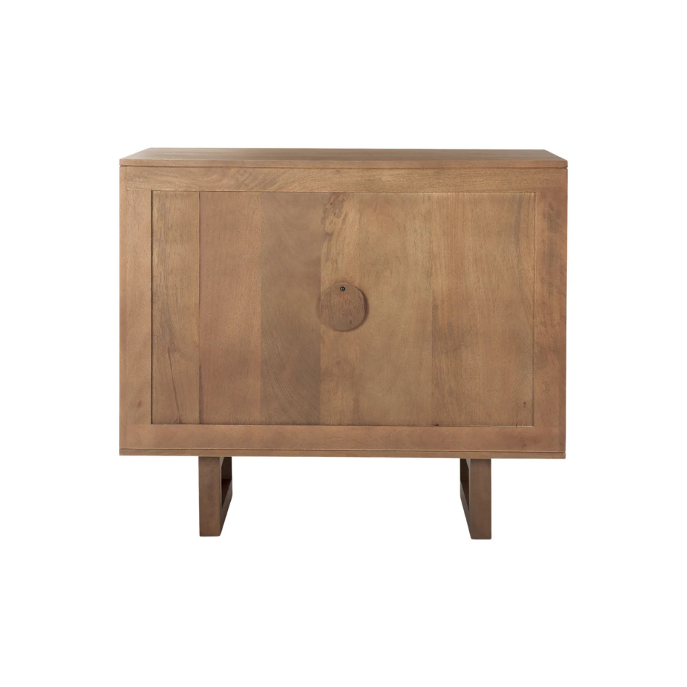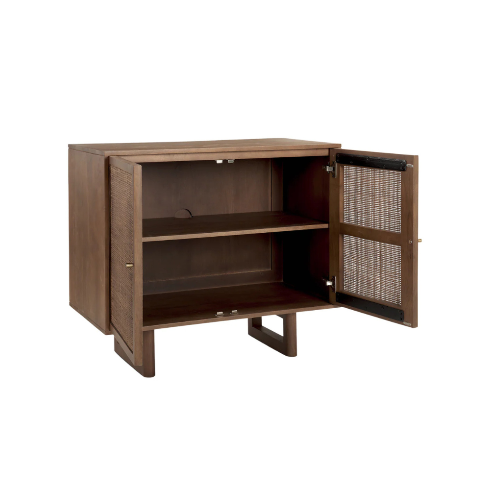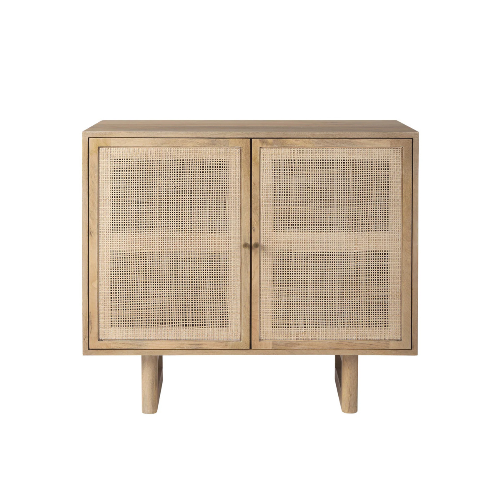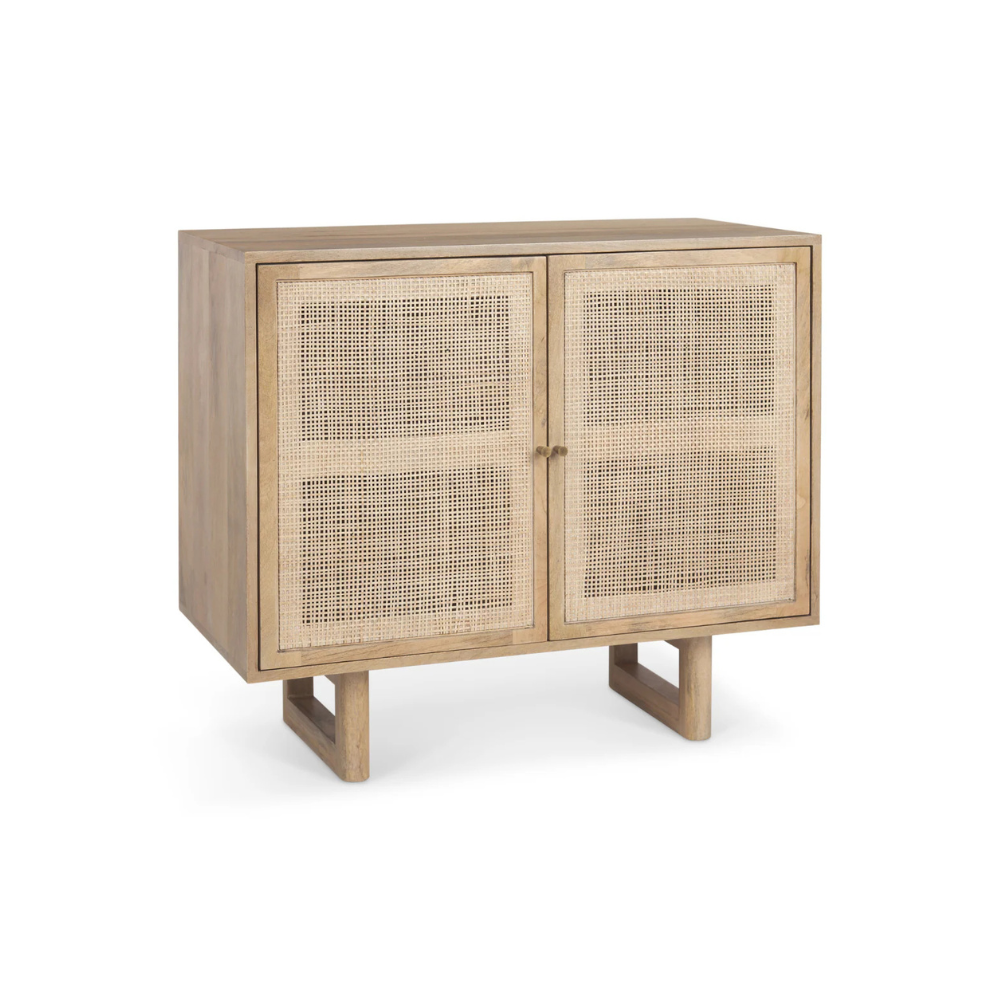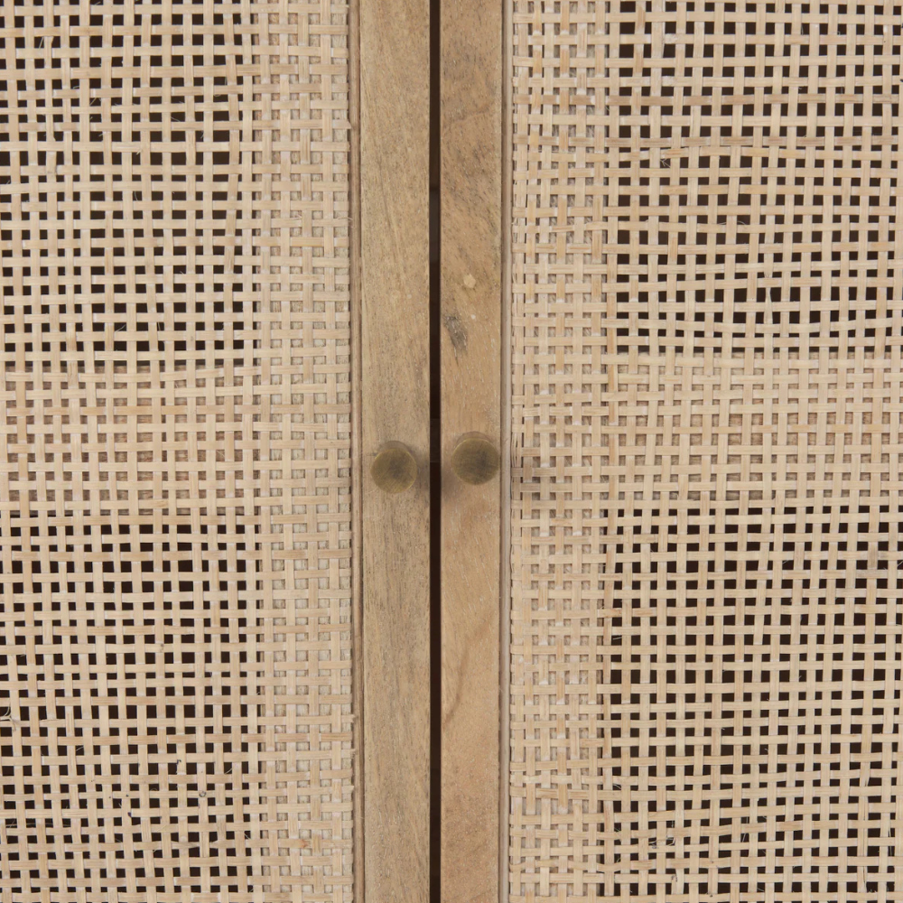 The Grier Accent Cabinet is crafted from solid wood, finished in a natural or walnut tone, and features two cabinet doors with a latticed cane front. Other notable features include dainty, brushed gold grips, two spacious shelves, unique legs that complement its silhouette, and a beautiful grain running through the wood finish. Place in entryways, living rooms, bedrooms, or bathrooms, this versatile piece offers convenient and stylish storage space for any room.