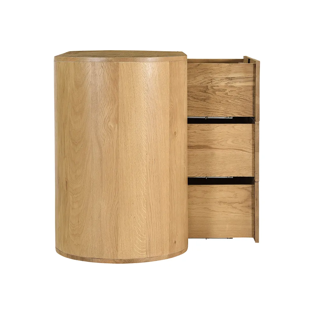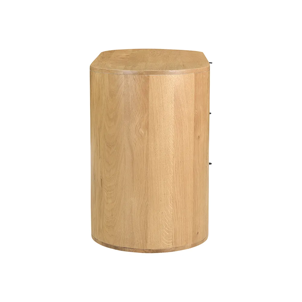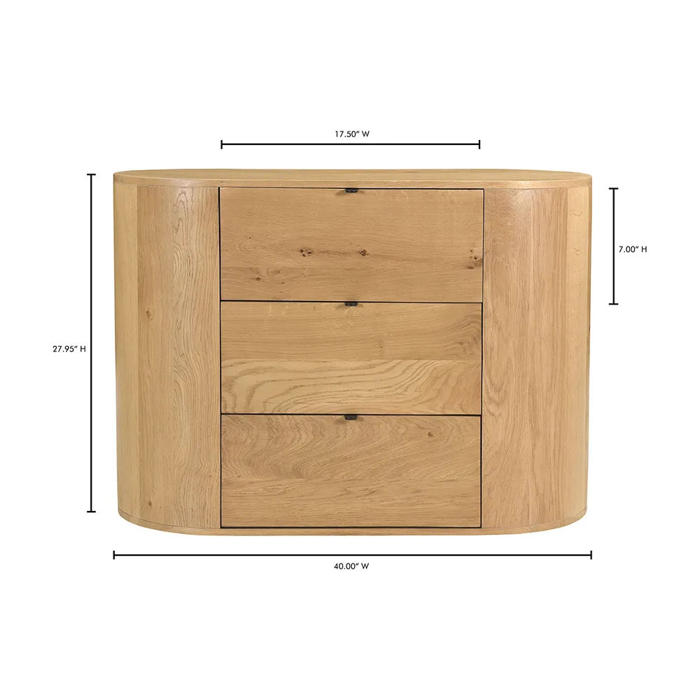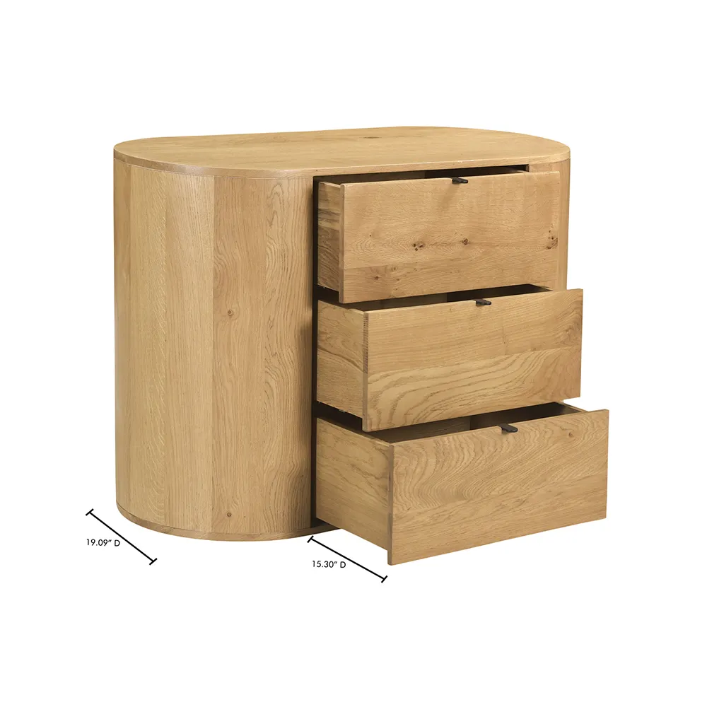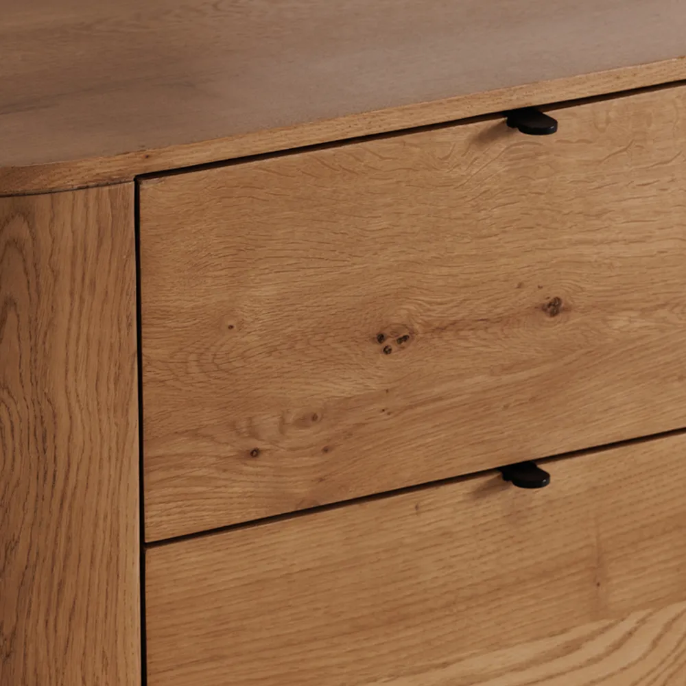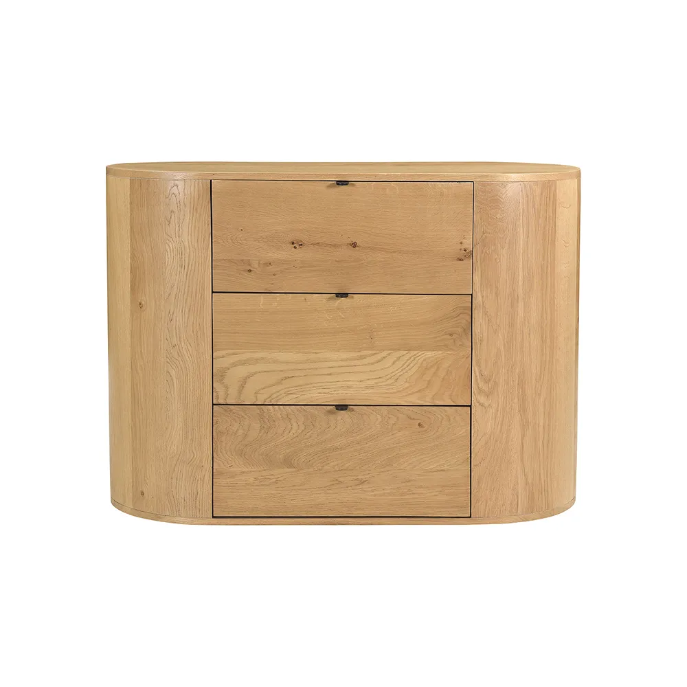 Modern sensibilities meet natural allure in the Harborton 3-drawer dresser. Crafted from solid wood, this exquisite piece showcases a minimalist design with gracefully curved lines that exude a calming warmth. The Theo dresser exemplifies a commitment to fine craftsmanship, seamlessly blending form and function with ample storage space elegantly concealed within its six drawers.