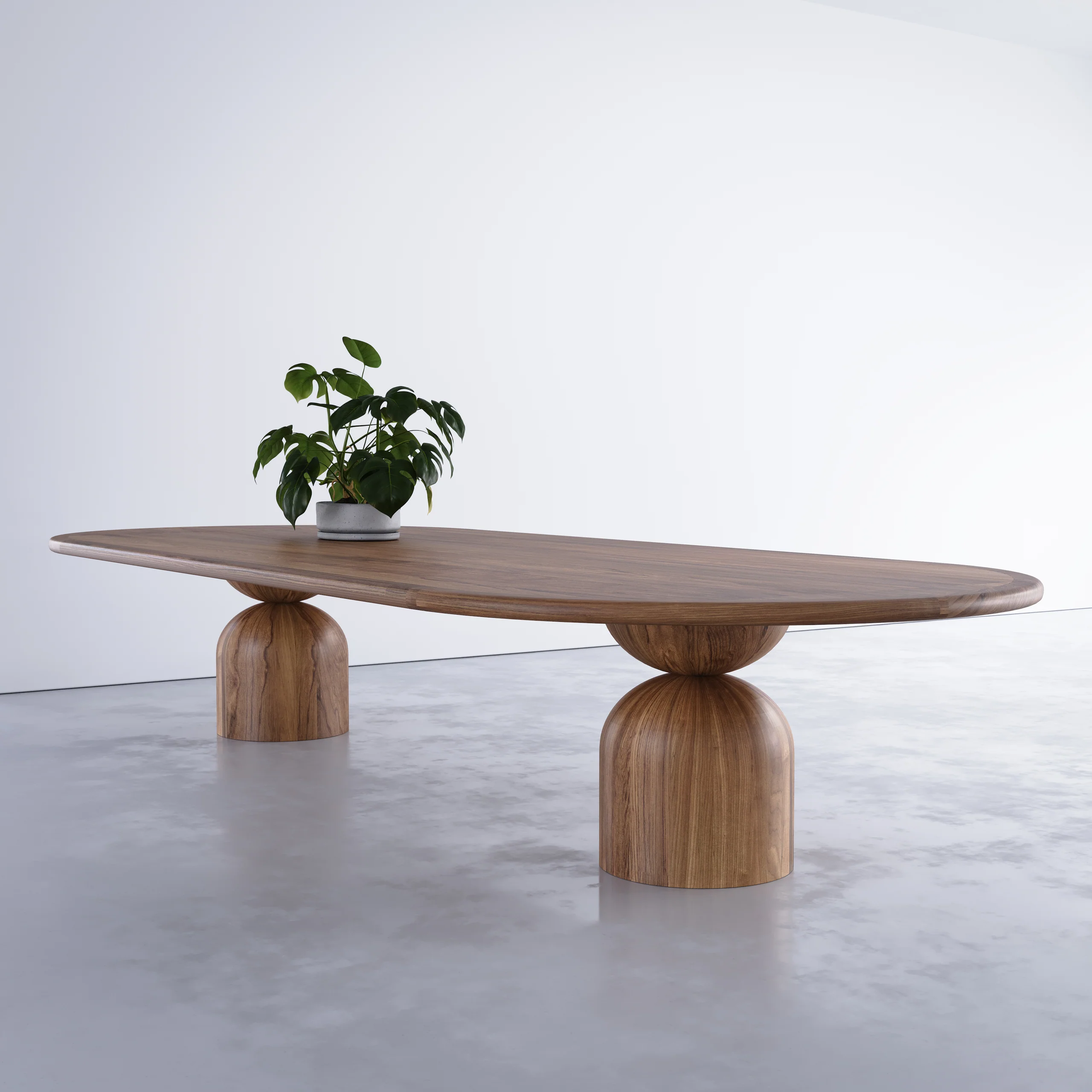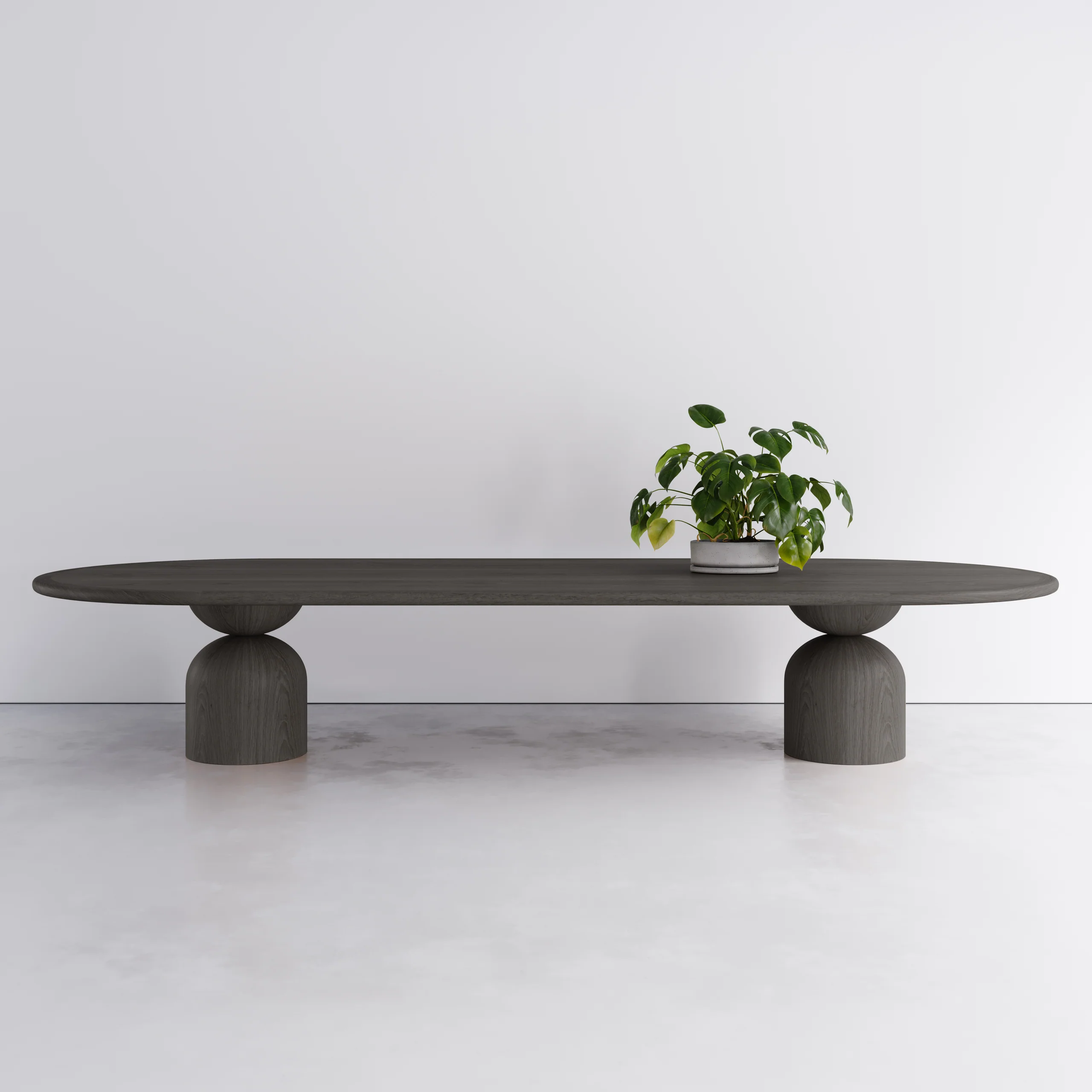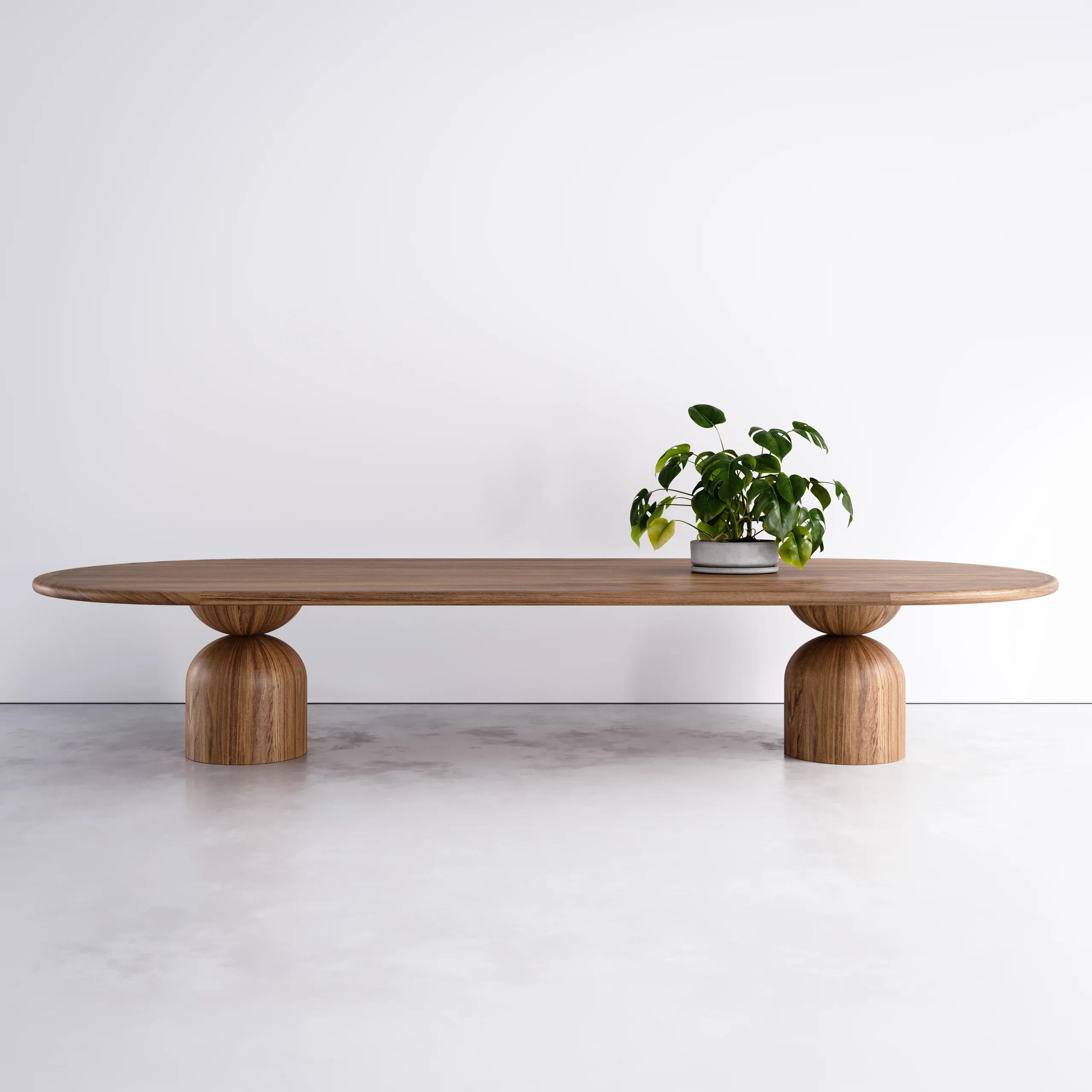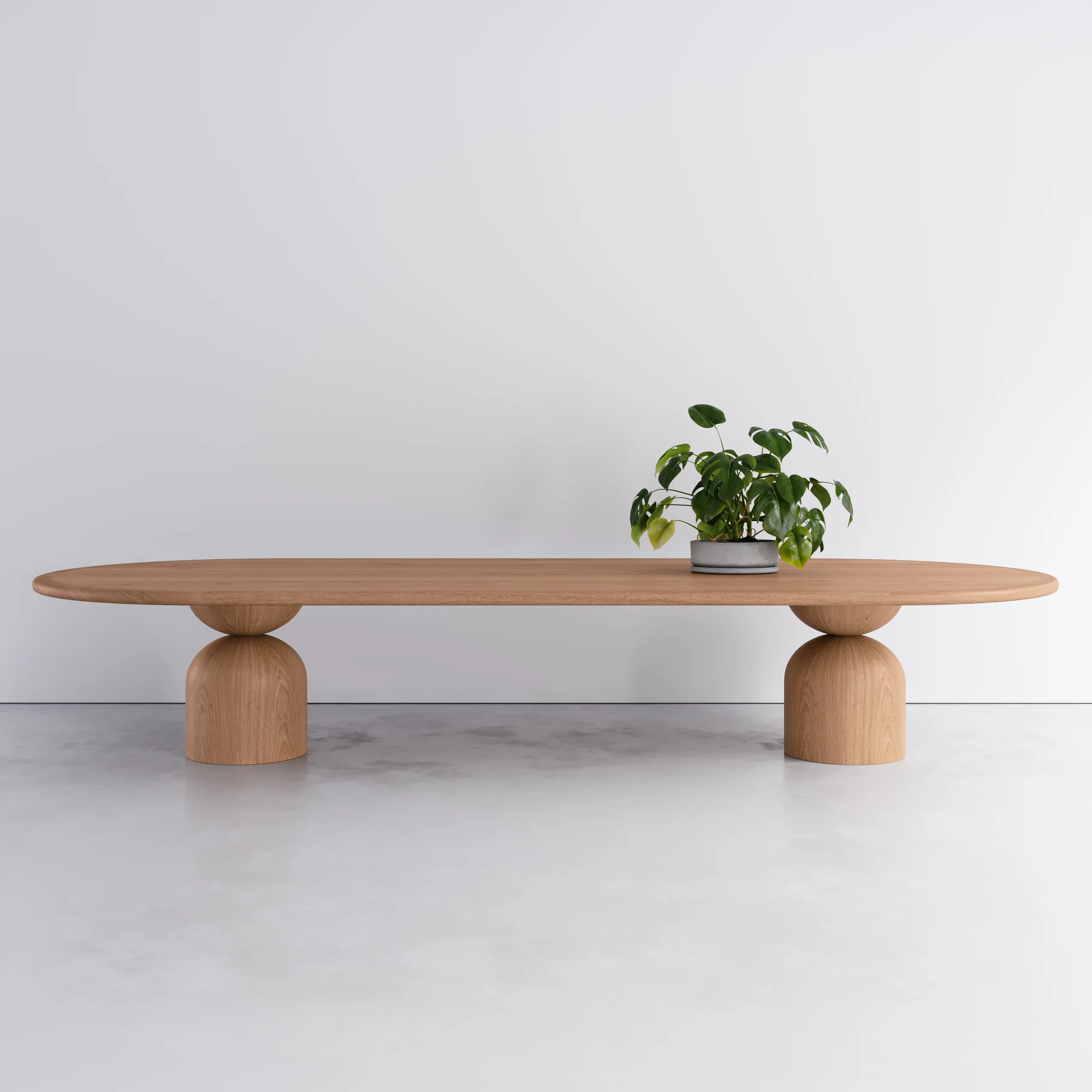 The Hearthcrest Oval Dining Table. It was inspired by the simple but wonderful pleasure of bringing people to a round table. The sculpted base, which has been handcrafted from solid wood, interprets the circle in the table top and also in its plinth footing, forming a unique element. It has a tactile simplicity with soft edges that makes bringing people together a delight. Designed for practical seating the base allows no interference. Suitable for both residential and commercial clients, and can be manufactured to any custom dimension, timber and finish.