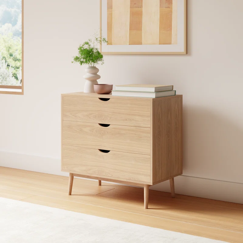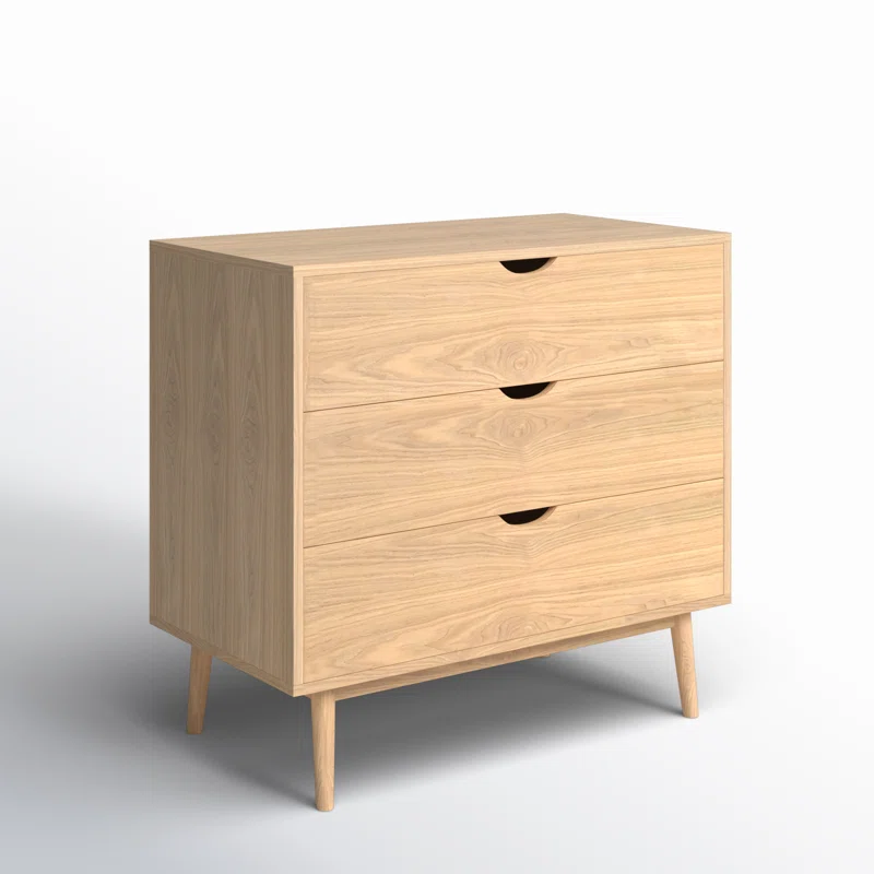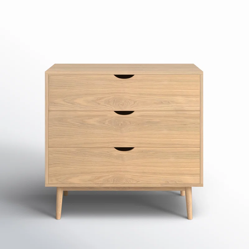 This Indra 3 Chest of Drawers is all mid-century. Crafted from kiln-dried solid wood and finished in a hue highlighting natural grain variation, it stands on tapered dowel legs and features cutout pulls that lean into the streamlined look. Tuck away clothes and linens in the three drawers for a clean, organized aesthetic. A wall anchor is included for extra safety and stability.