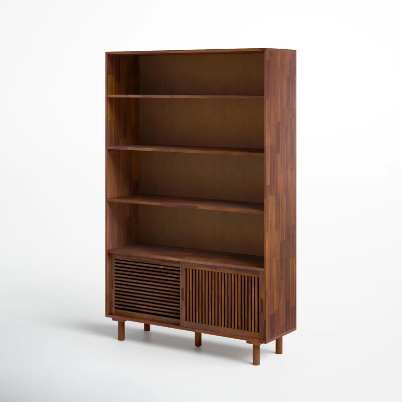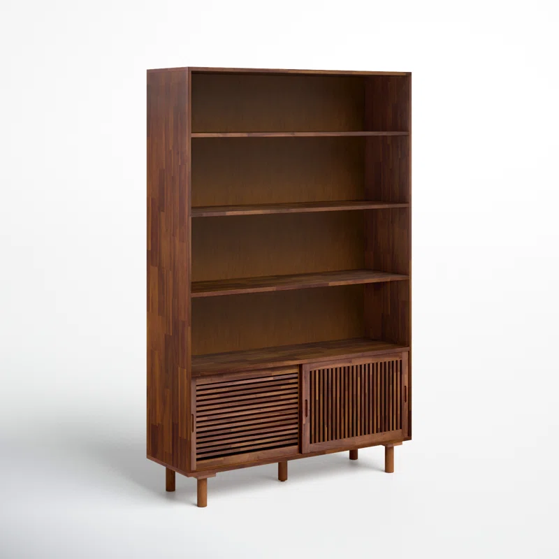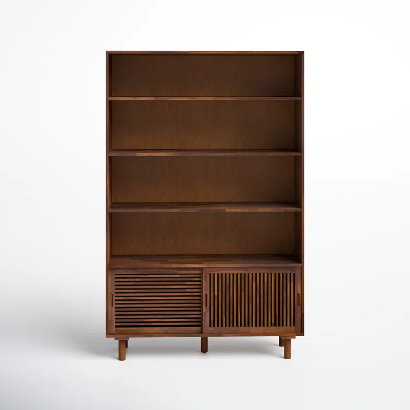 With a nod to mid-century modern style, this Jaime Wide Bookcase brings warm wood tones and clean lines to your space. The large frame is made from solid wood in a rustic, dark brown hue, and it rests on slim, rounded legs for a sleek look. Four display shelves are just right for a collection of books and accent pieces. On the bottom, this bookcase features two shutter-inspired doors that reveal concealed storage space for extra odds and ends. Plus, it has a closed back that makes it easy to place against any wall in your living room.