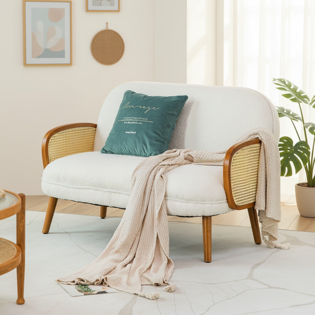 The perfect blend of modern and rustic charm, our Jena Modern Sofa features a plush backrest and seats flanked by rustic rattan armrests. The oval-shaped backrest and seats provide a unique and inviting seating experience that exudes comfort. With a plethora of color options available, this sofa will fit right into any rustic, eclectic, Japandi or hygge living room.