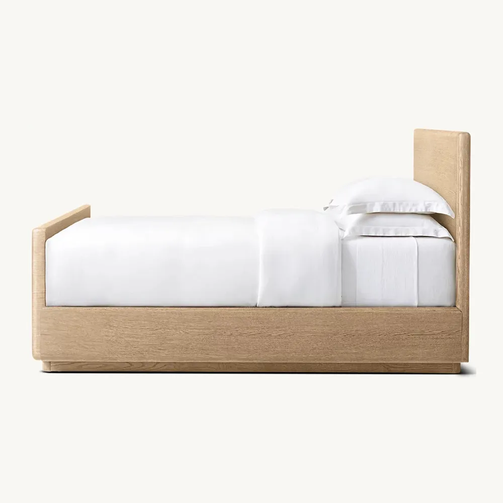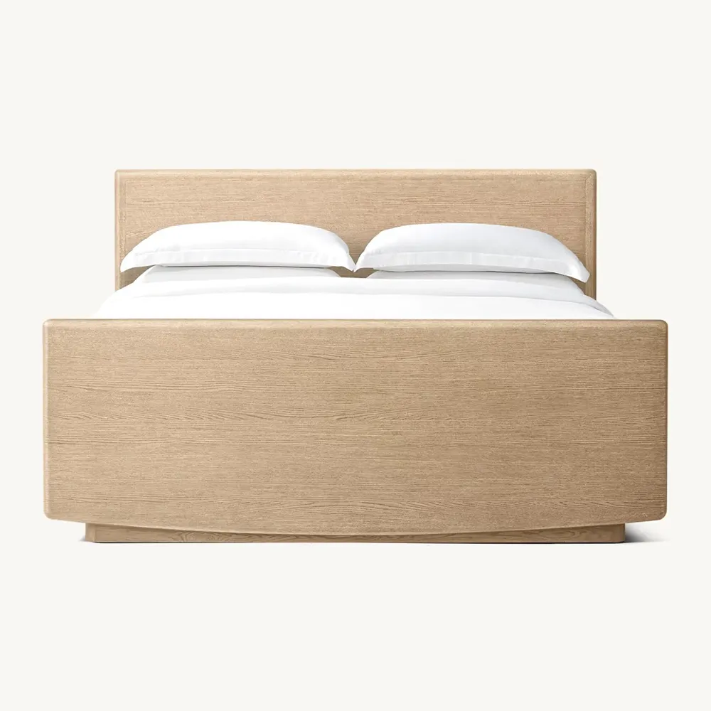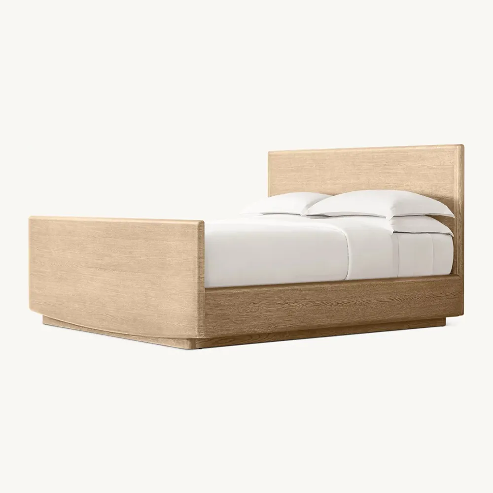 Lancaster Panel Bed with Footboard is a harmonious blend of sleek planes, sculptural curves, and nuanced details. Meticulously handcrafted of richly grained solid wood, it balances strong architectural presence with understated elegance. The recessed plinth base casts a shadow line, accentuating the rounded profile.