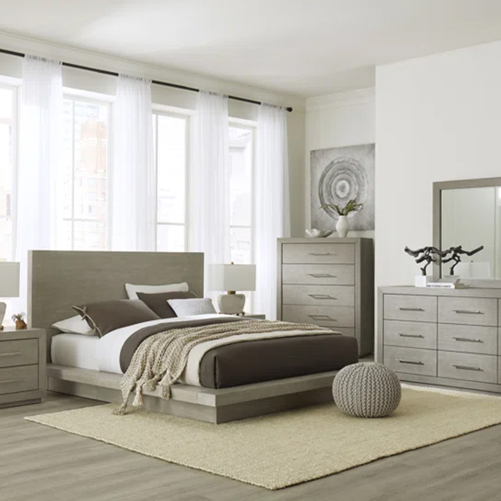 The Melbourne bedroom offers a choice of true platform Meryl Panel Bed styles in a timeless modern silhouette. This generously scaled bedroom features crisp mitered edges, floating plinth-style bases, and a low-slung, minimalist modern appeal. Acacia solid wood is lightly wire brushed, creating inviting, tactile surfaces that add warmth and comfort to the bedroom.