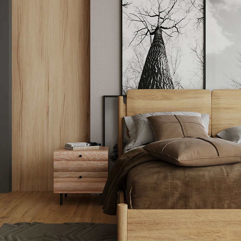 Our Daniel bed is a dramatic addition to any bedroom space. The bed features a sculptured profile with soft edges. The textured surface is sealed with a water-based finish to highlight the natural beauty of the grain.