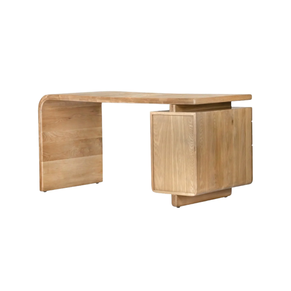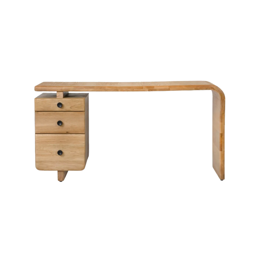 Porter Study Desk makes a playful statement in solid wood. Handsome and hard-working, the Current features a sweeping desktop and 2 storage drawers, including 1 for hanging files. The desk’s warm colour and cathedral grain contrast dramatically with the custom cast drawer pulls, emphasizing its sculptural presence.