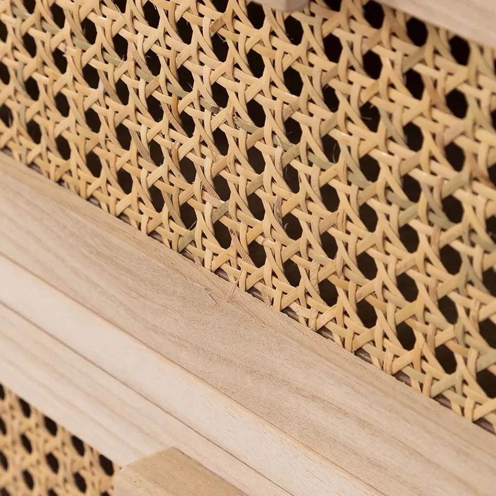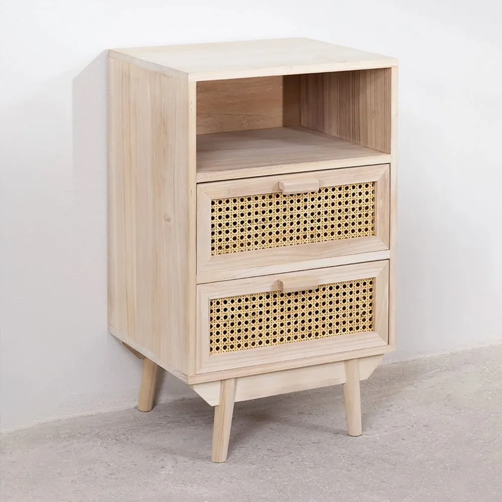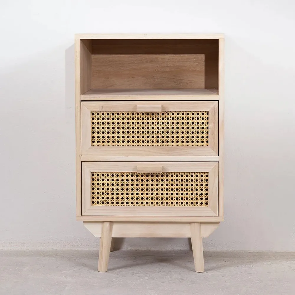 Our Ralik Bedside Table with Drawers is perfect for any room in your home. Designed following vintage style trends, it combines the robustness and resistance of natural solid wood with natural cane decoration. A storage cabinet with two drawers and a shelf that will allow you to display and organize everything you need at any time, keep your home tidy and clean without losing the elegance and sophistication you deserve. Thanks to its functionality, you will not resist the temptation to place it where you need it most, not only as a wonderful nightstand but also as a side table or storage unit.