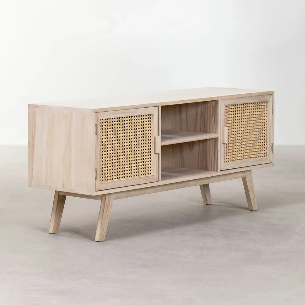 The Ralik Granite Edge TV Cabinet is an icon of the renewed vintage style with a natural finish that we love. It is made of robust and resistant solid wood and has three organization spaces, two of them on the sides accompanied by doors decorated with carnage-style rattan and the third located in the center with a shelf. It also includes holes in the back to organize wiring. Functional and practical, it brings elegance and sophistication to your living room.
