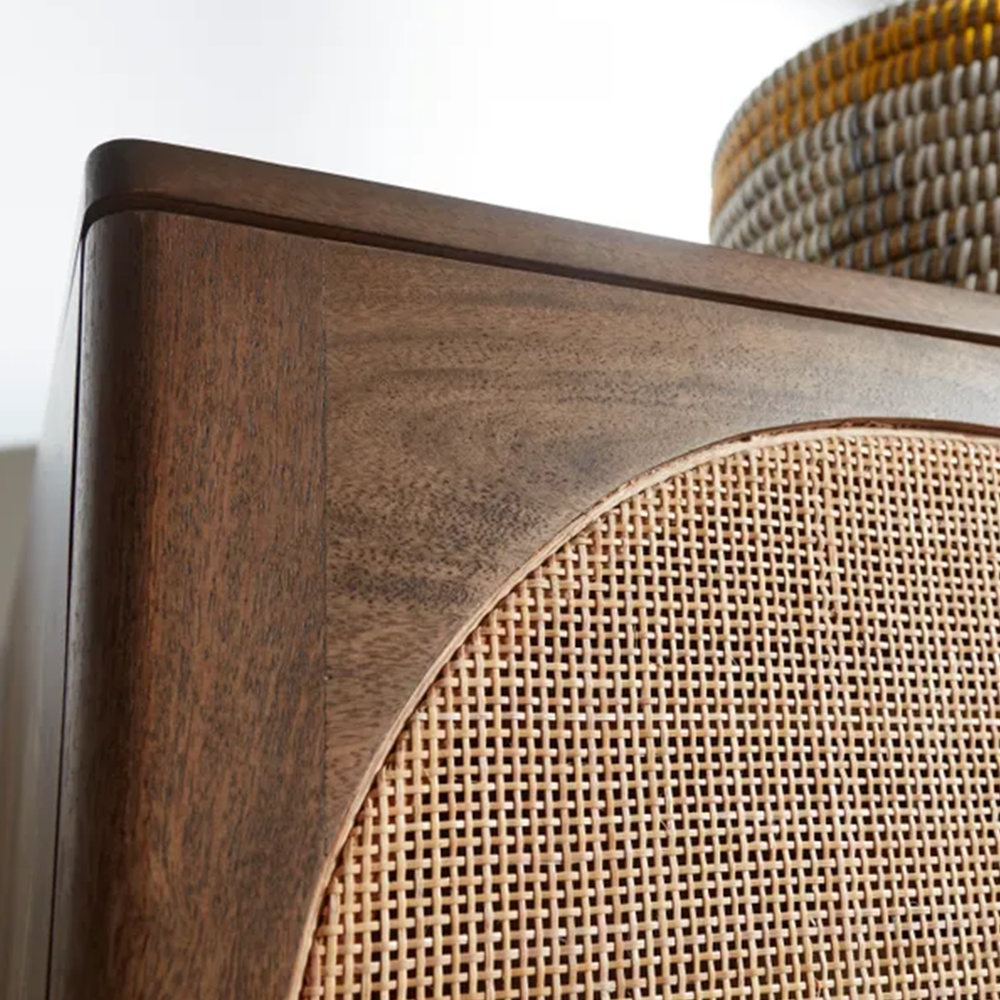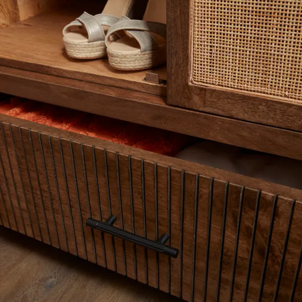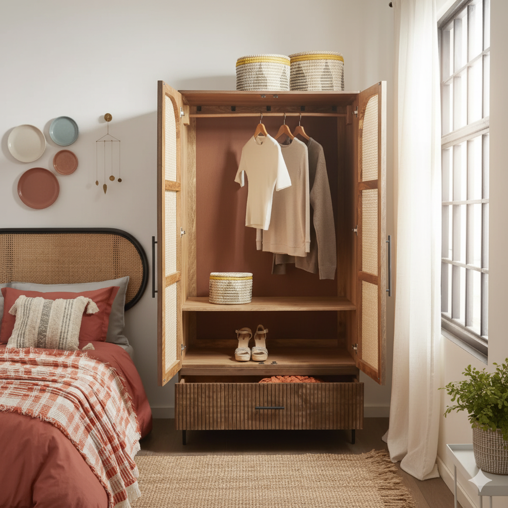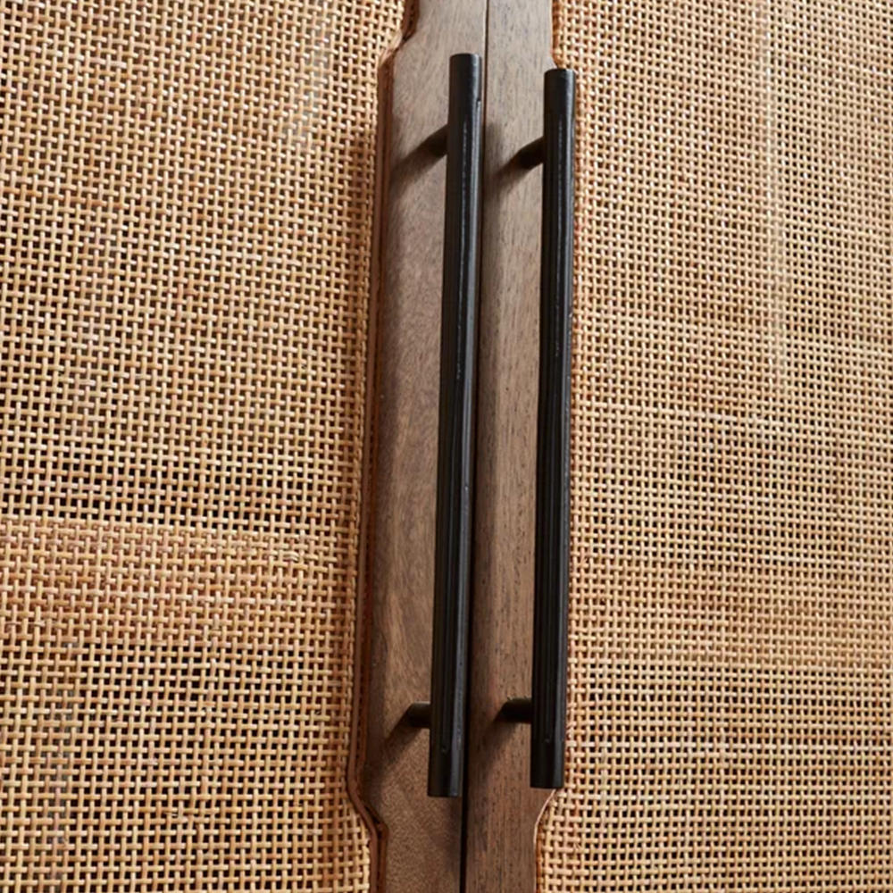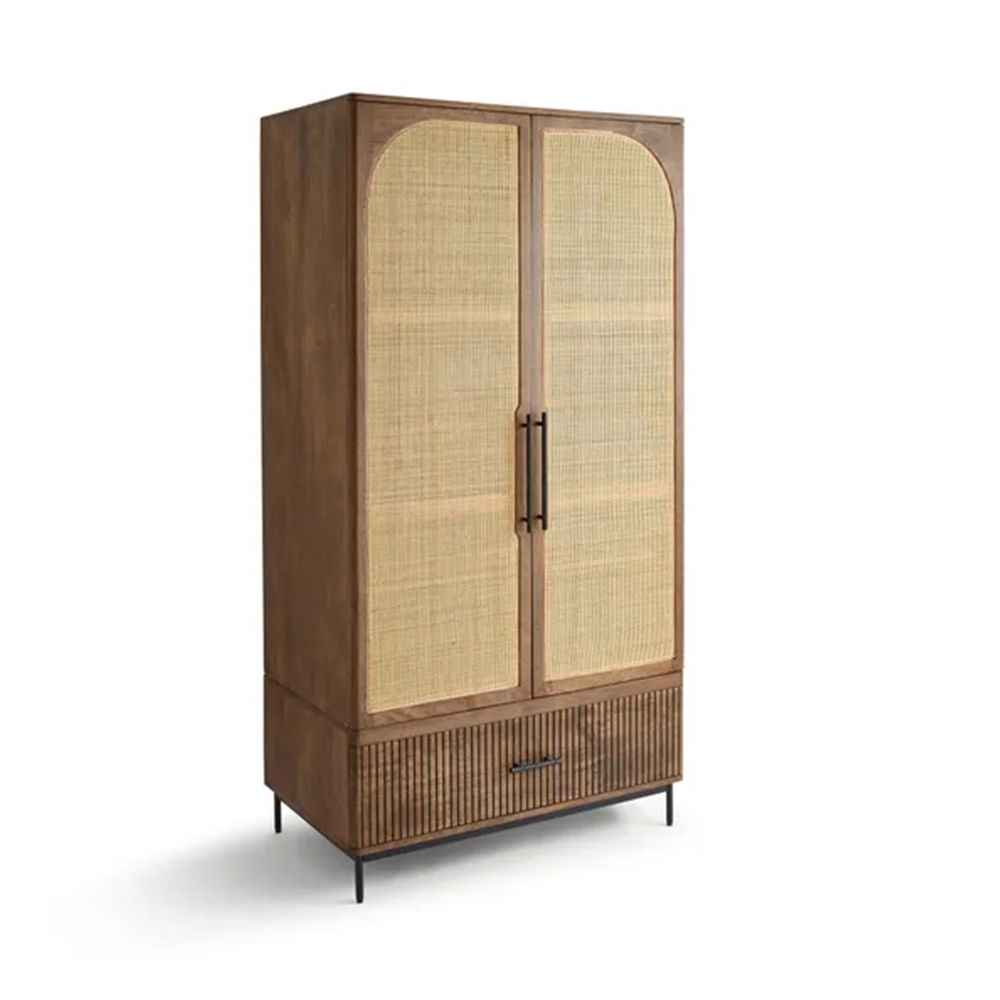 The Rattan Arched Door Wardrobe embodies a perfect blend of contemporary design and global inspiration. Crafted from rich, dark-stained Acacia wood, this wardrobe offers a striking contrast with its sleek black metal bar handles and legs. The two intricately detailed rattan doors and grooved drawer enhance its exotic charm, while the spacious interior includes a sturdy wooden hanging rail for all your wardrobe essentials. This piece not only adds warmth and texture to your bedroom but also brings a cohesive, globally inspired look to your home.