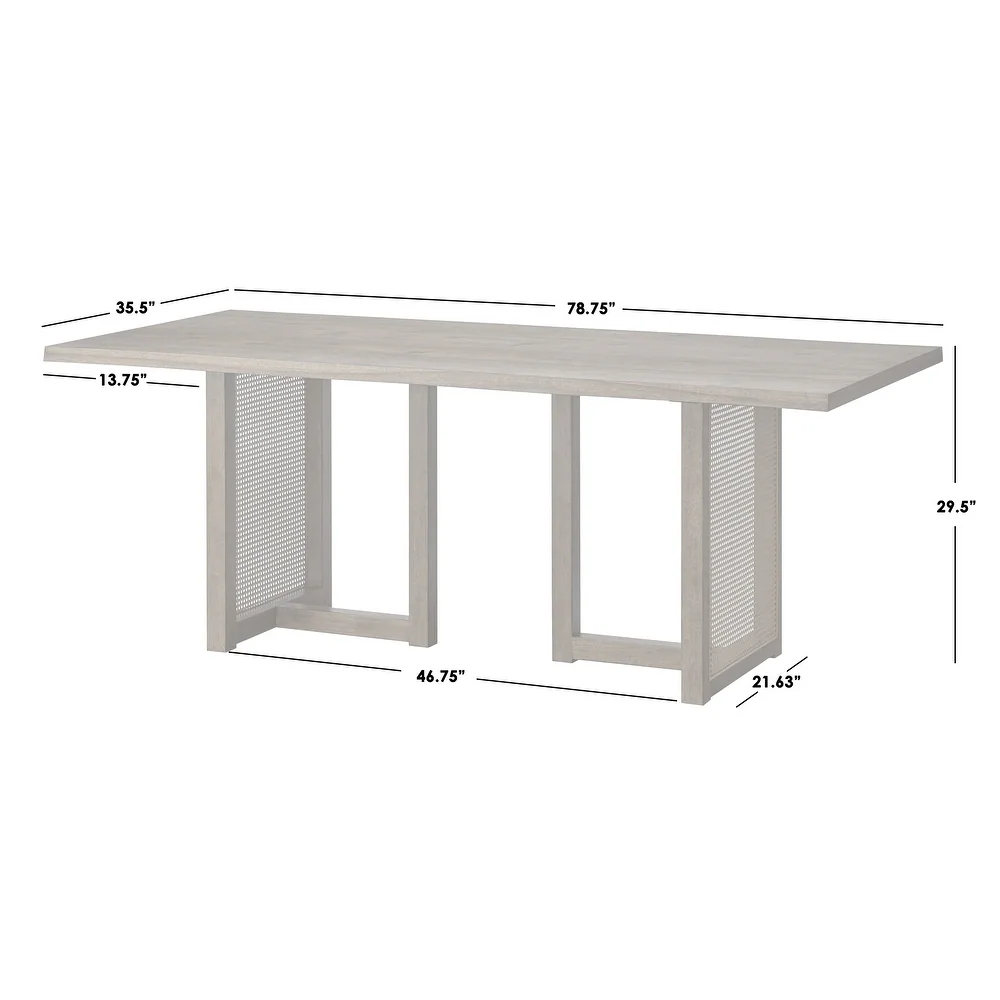 Rectangular Dining Table with 6 Chairs it’s a unique sophistication. Woven panels on the table legs and chair-backs, crafted from a rattan-like material, add visual interest to your dining space. The tabletop, crafted of solid wood, measures nearly 79 inches wide and displays stunning wood grain in a Colonial natural finish and live edge on the long sides. The matching chairs feature striking V-style legs with cushioned seats wrapped in a soft, linen-like fabric. Whether you’re hosting a formal dinner party or enjoying a casual family meal, this dining set will elevate your dining experience. Seats 6 comfortably. Set includes a table and four or six chairs.
