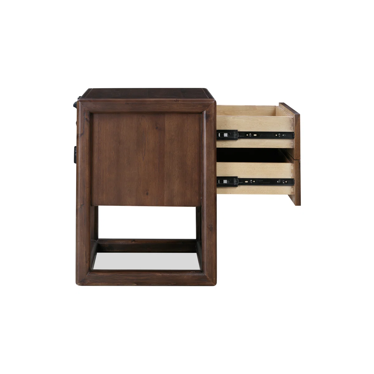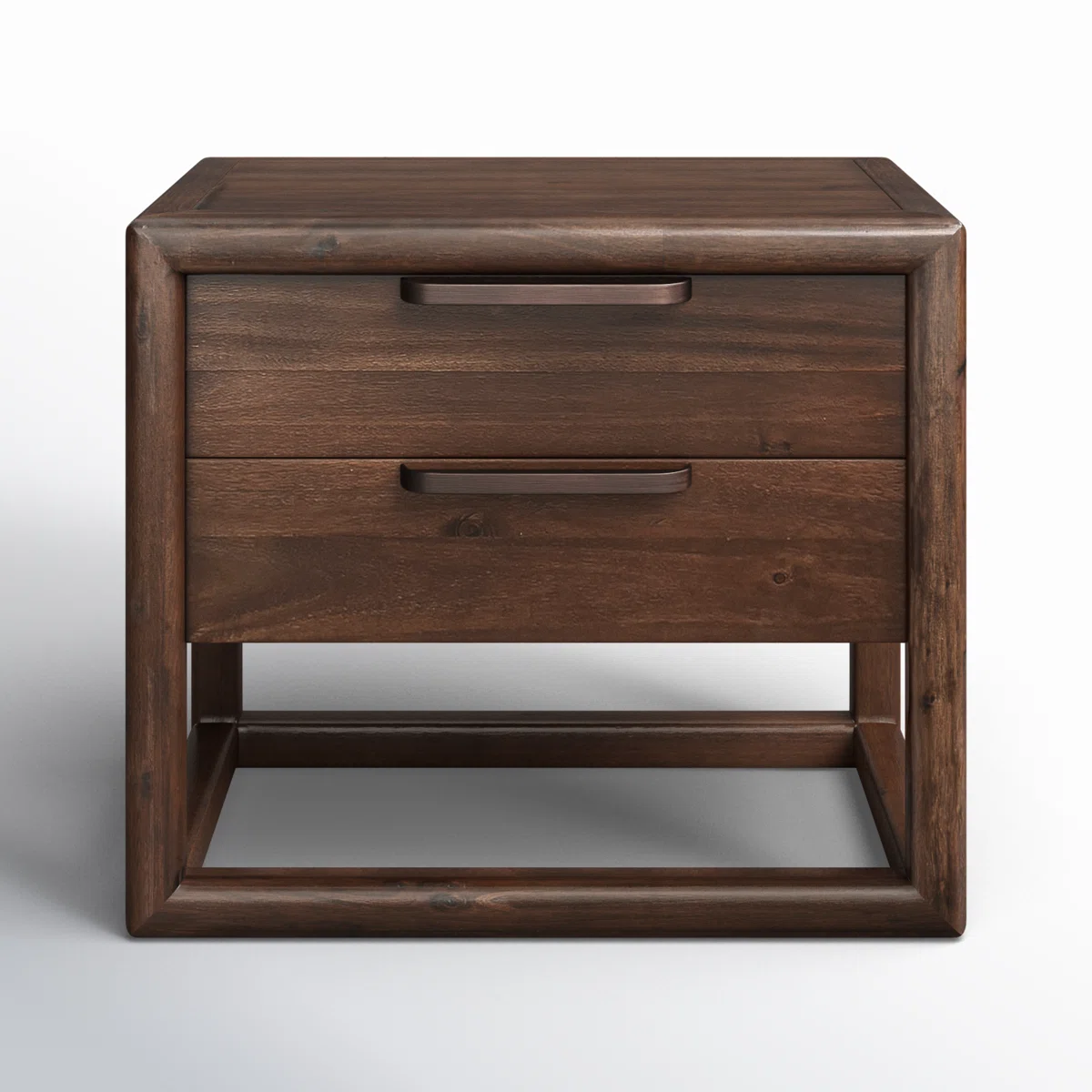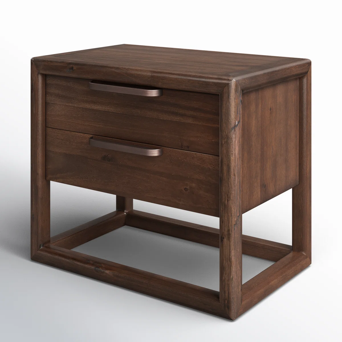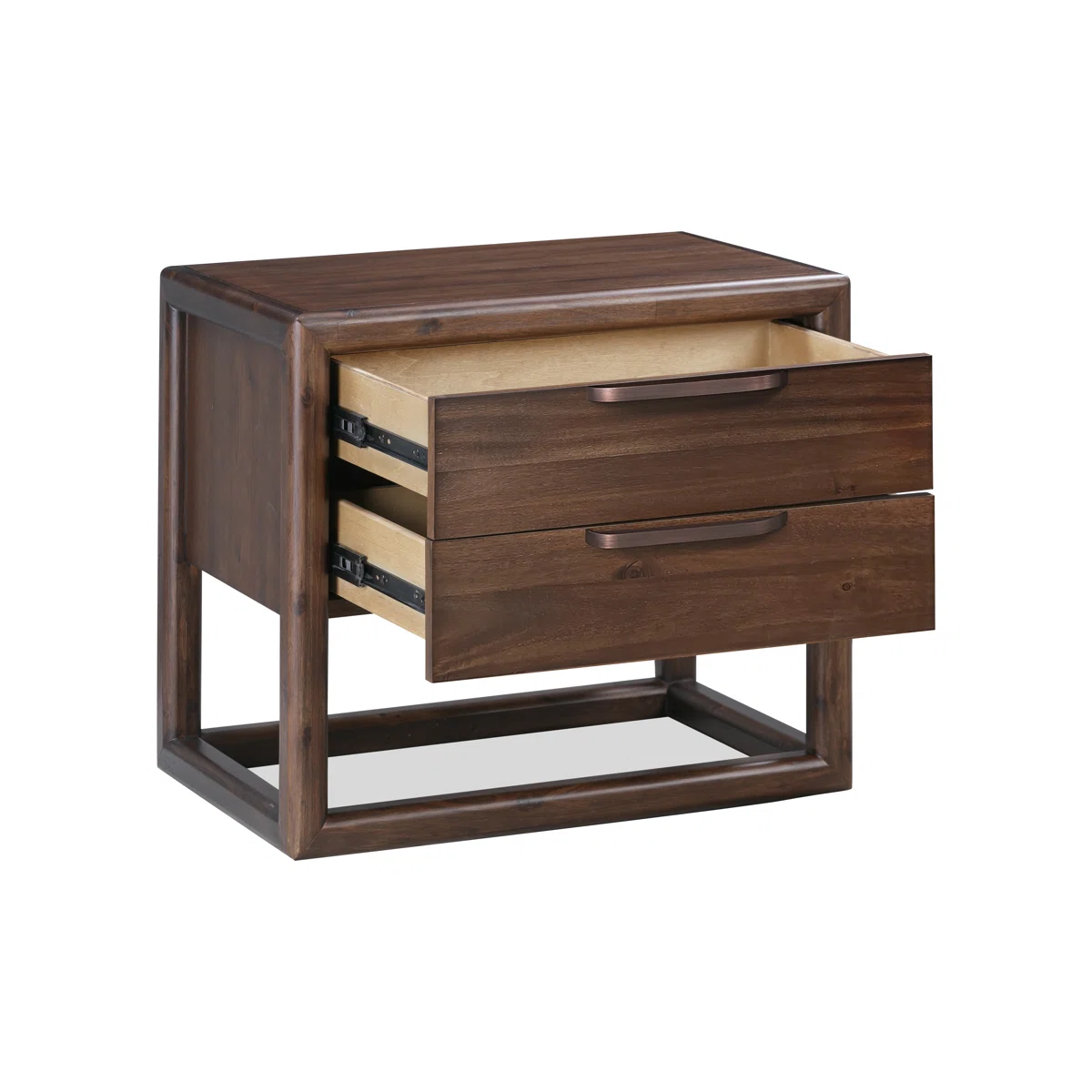 The Rosy Two Drawer Nightstand is a soft, open and airy take on modern design with its frame-style bases, lifted cabinets, and bullnose edges. Made from Acacia wood, the transparent, rich brown stain showcases naturally occurring colors and grain figures. The low sheen lacquer and open pores in the wood grain create inviting, tactile surfaces that are both natural and refined.