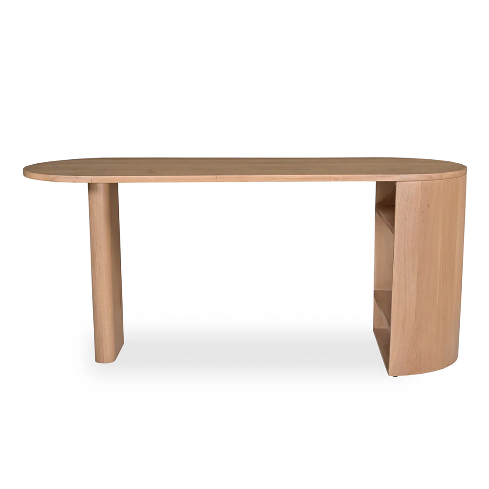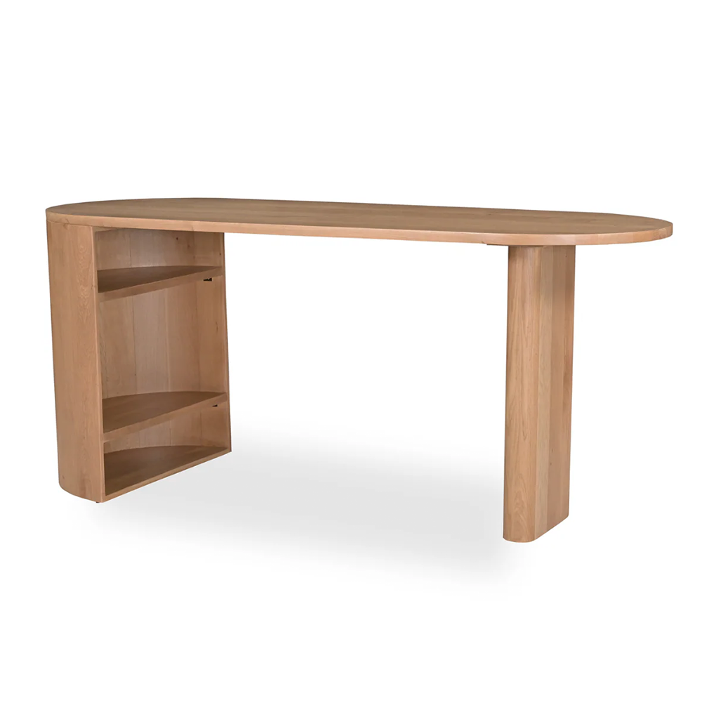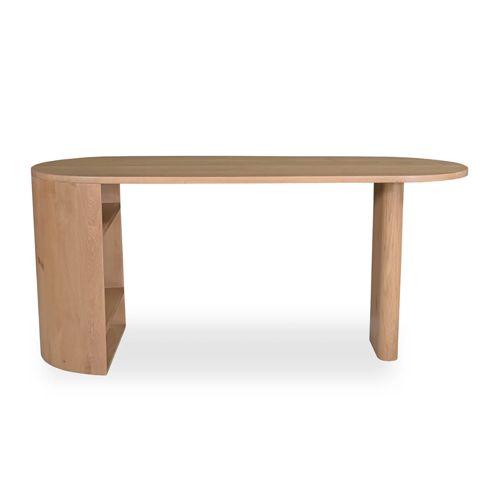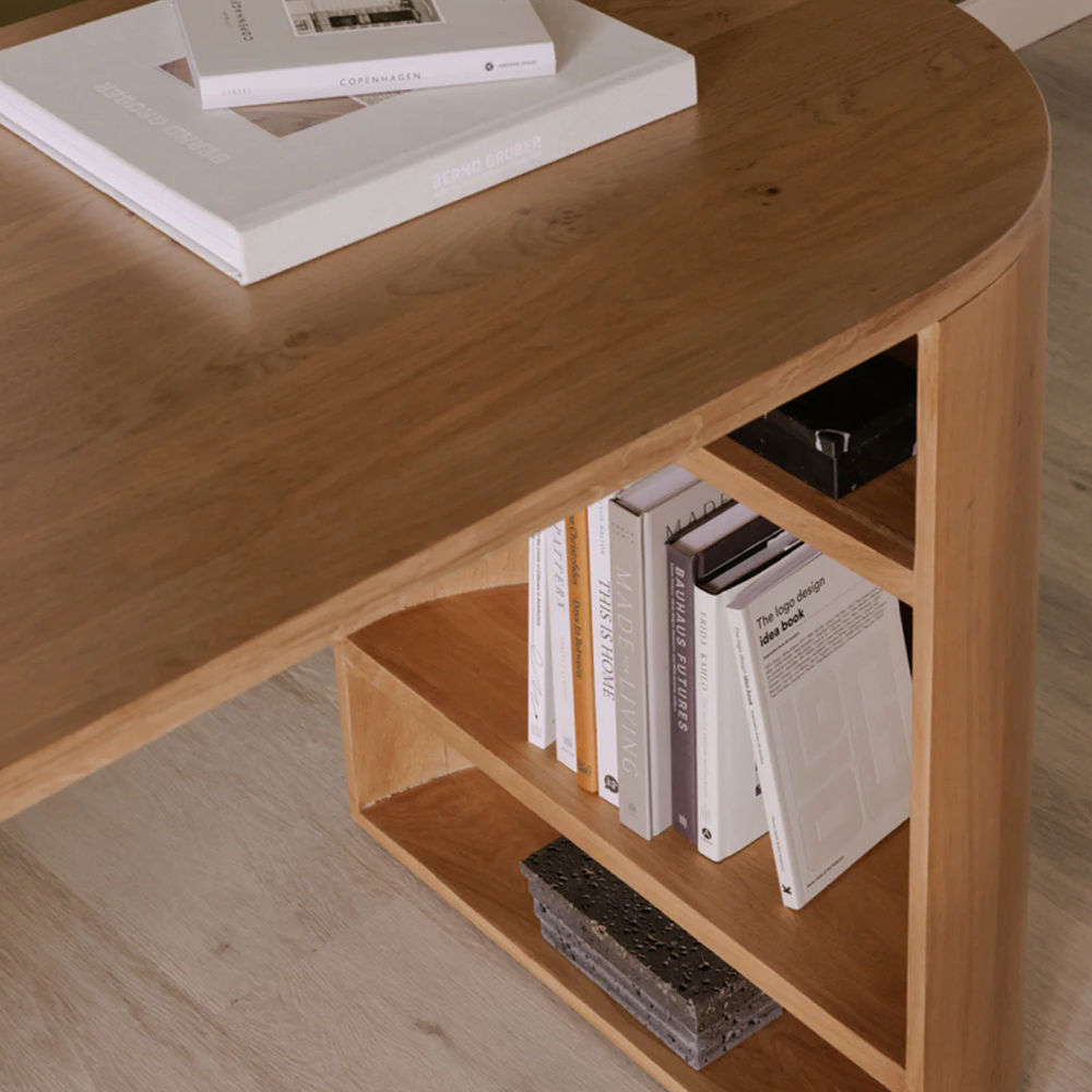 The Theo Study Table features a curved, minimalist design adaptive to modern homes and contemporary lifestyles. Fashionable and functional, it embodies our commitment to craftsmanship and timeless design. Spacious with 3 open shelves, this desk is a handsome, practical office solution.