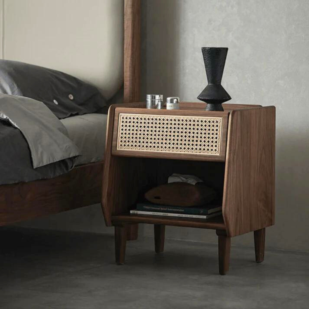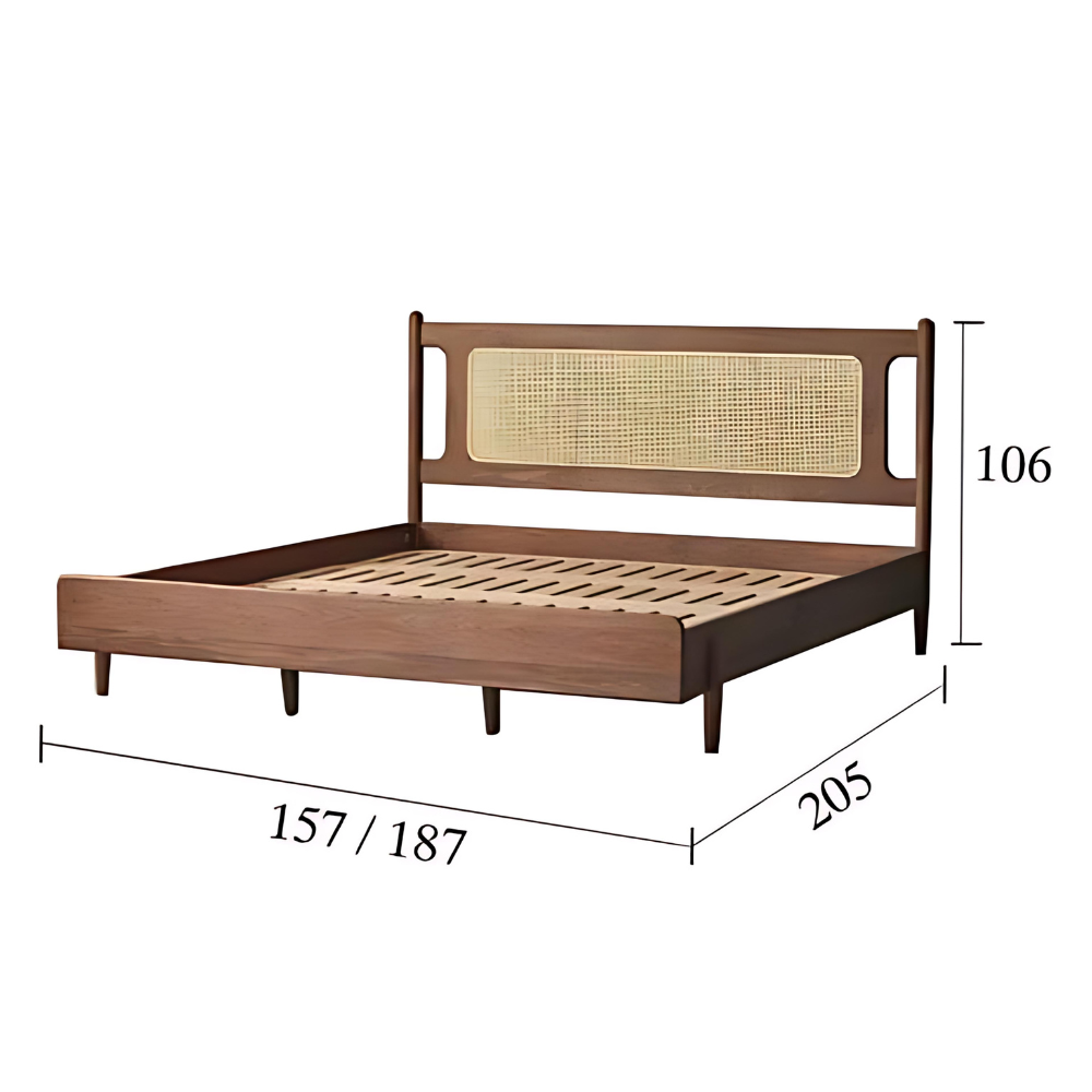 Experience the perfect blend of modern minimalism and natural elegance with our Walden Rattan Bed, beautifully finished in a rich black walnut color. This bed stands out with its exceptional use of high-quality materials, including North American FAS-grade White Wax wood and meticulously handwoven rattan, ensuring both style and durability.